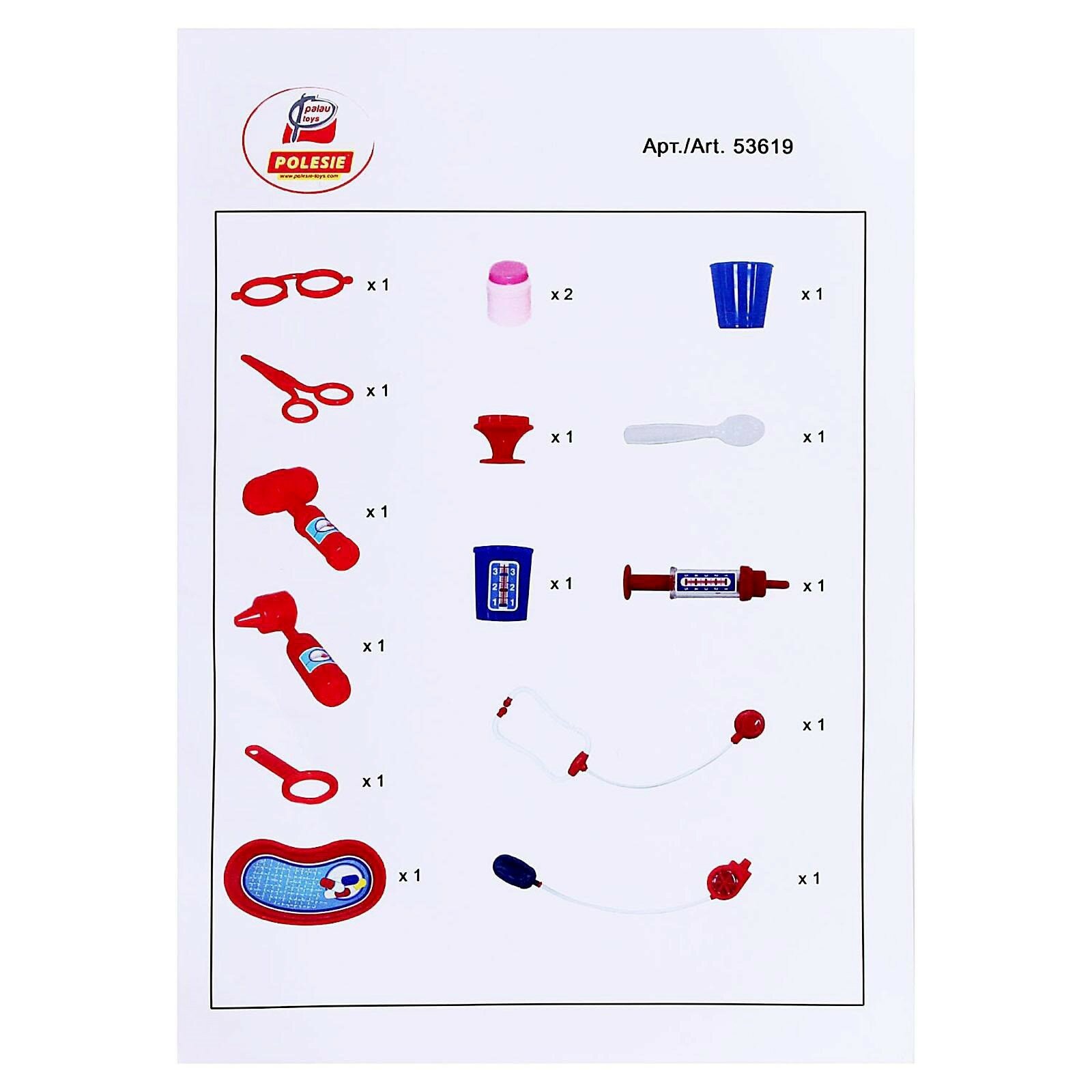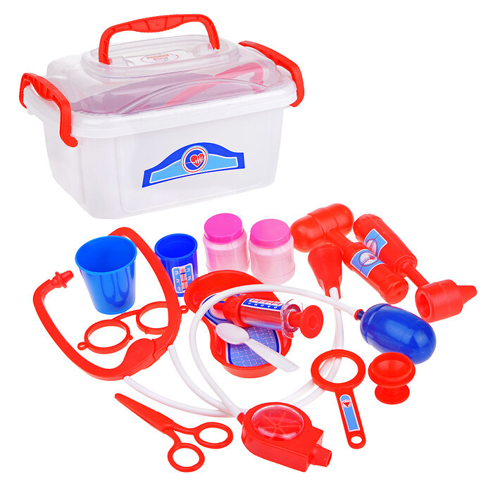 | Комплектация | Ножницы, очки, лупа, шприц, лоток для инструментов, ложечка, стетоскоп, тонометр, отоскоп, молоточек, мерный стаканчик с крышкой, стаканчик, баночки |