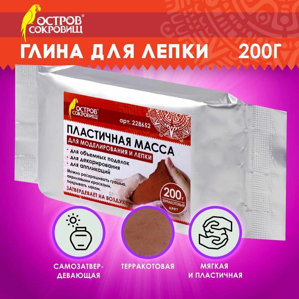 Паста (масса) для моделирования и скульптурной лепки художественная для творчества Остров Сокровищ, самозатвердевающая, 200 г, терракотовая, 228652