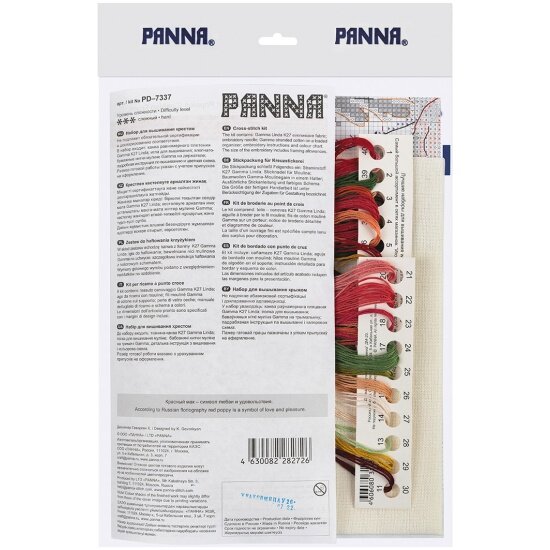 | Комплектация | канва равномерного плетения Gamma K27 Linda; хлопчатобумажные нитки мулине Gamma на держателе; игла для вышивания; подробная инструкция по вышиванию и цветная схема |