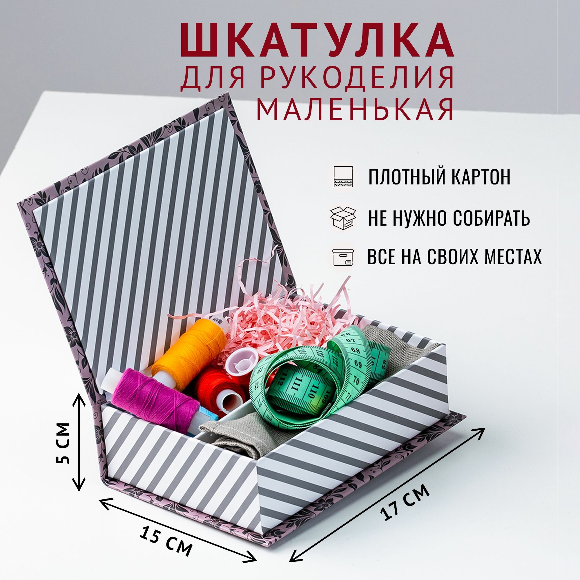 Подарочная Коробка - Шкатулка Cartonnage для рукоделия маленькая, 170 x 120 x 50 мм. "Цветы/полоски", розовый