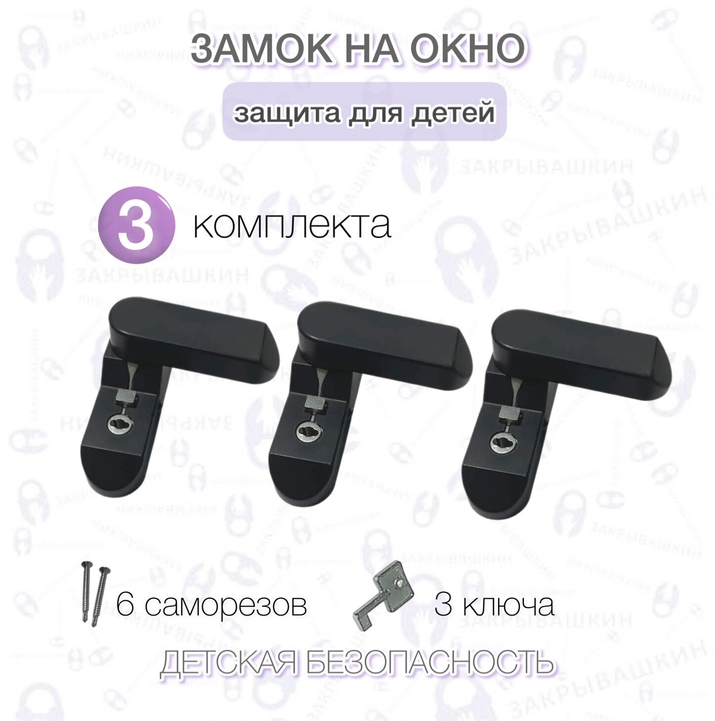 Купить Блокираторы оконные для безопасности детей, замок с ключом, цвет черный, комплект 3 шт.