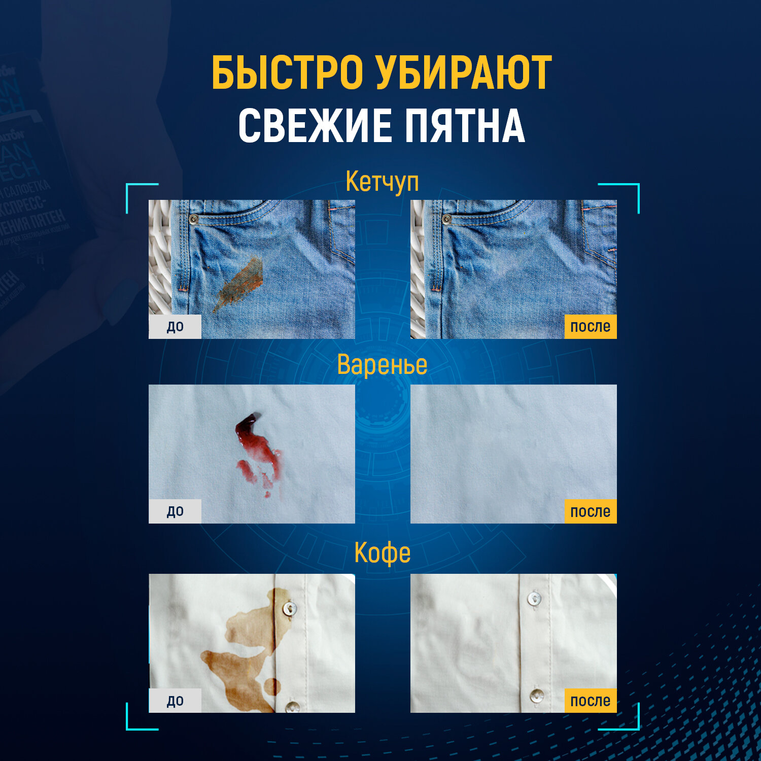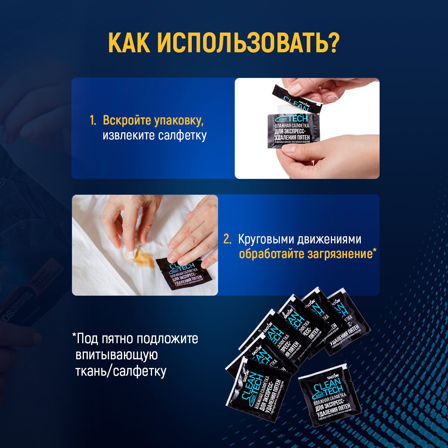 | Способ применения | Вскройте упаковку и извлеките салфетку. Под пятно подложите впитывающую ткань. Круговыми движениями обработайте загрязнение влажной салфеткой Salton CleanTech. |