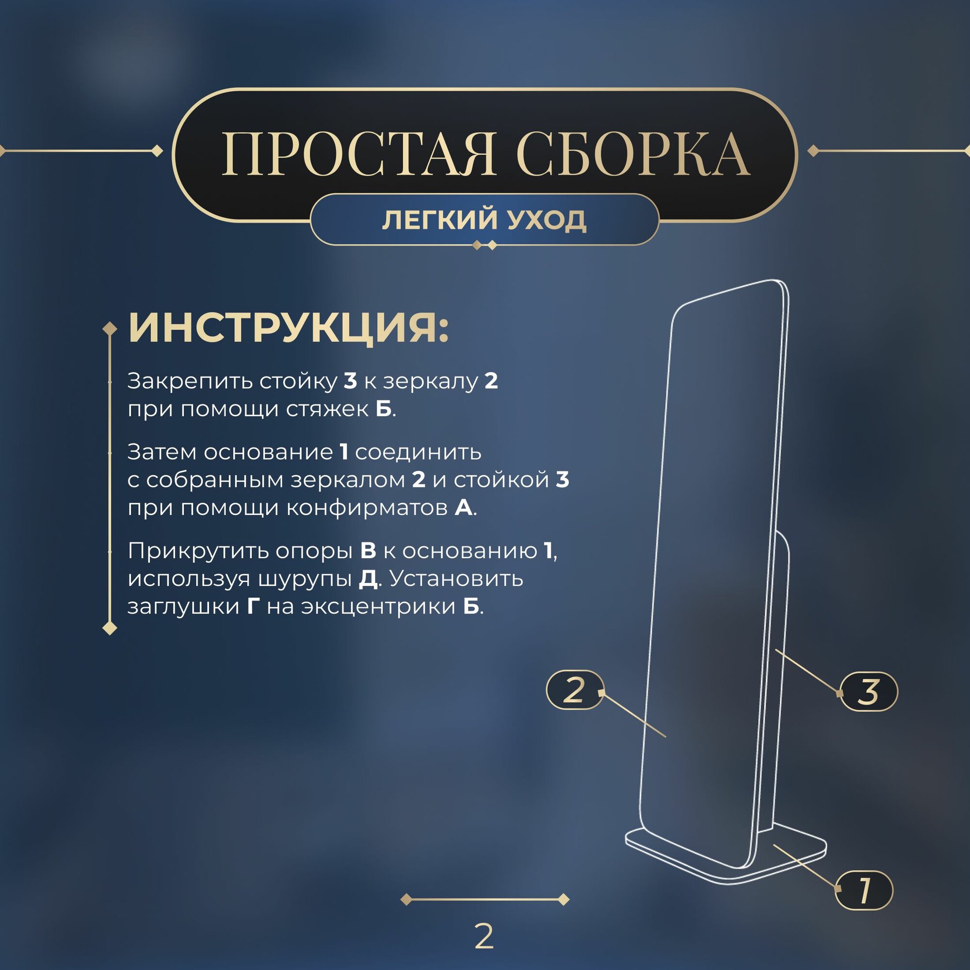 | Комплектация | 1.Основание 500х434х16 1 шт. 2.ЛДСП+зеркало 1603х500х20 1 шт. 3.Стойка крепления зеркала 960х248х16 1 шт. 4.Винт-конфирмат 4 шт. 5.Эксц. стяжка 3 шт. 6.Опора 4 шт. 7.Заглушка эксц. 3 шт. 8.Шуруп 4 шт. 9.Ключ ш/гр 1 шт. |