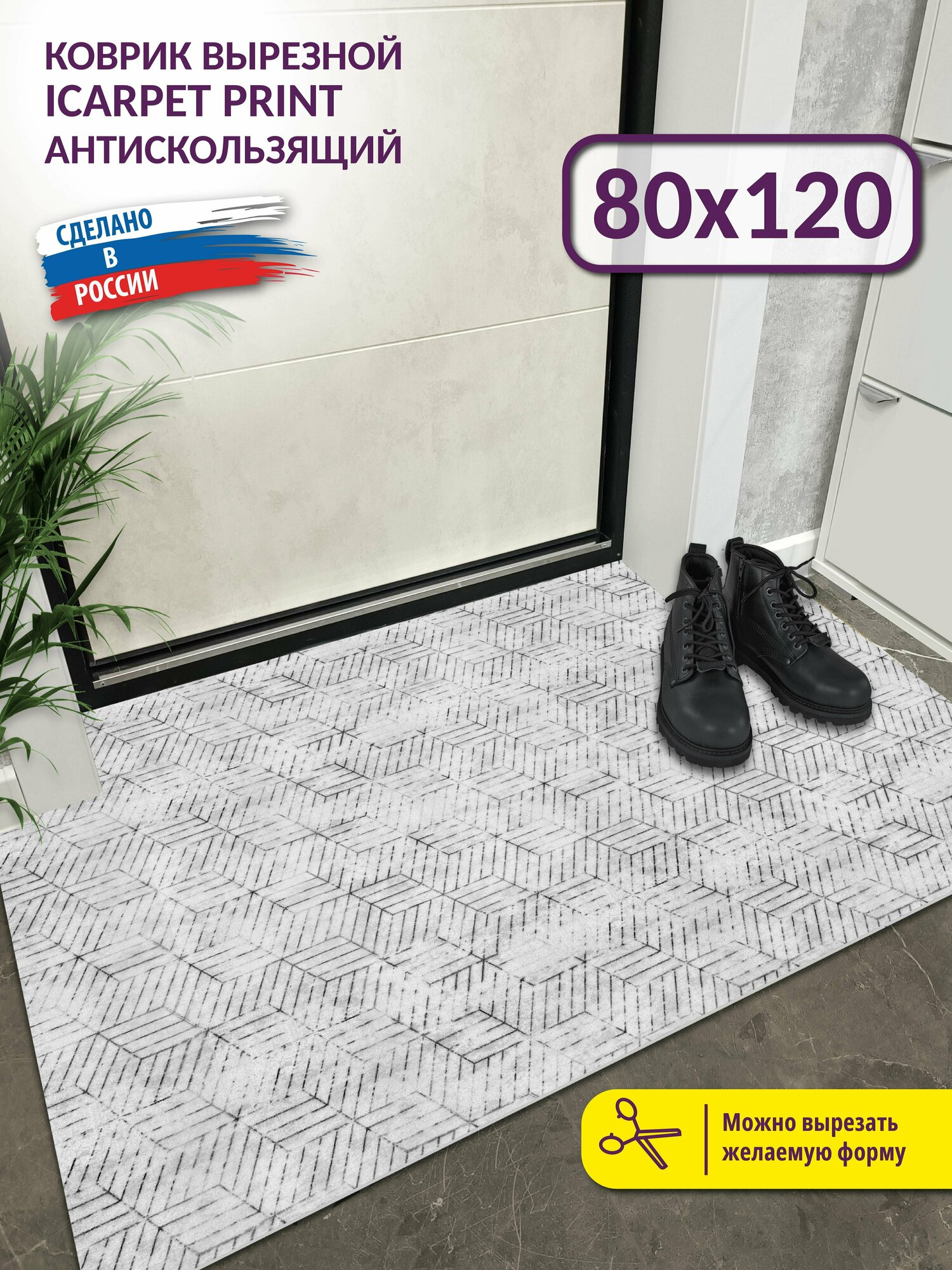 Коврик придверный вырезной Icarpet PRINT 120х200 3D Куб серо-бежевый, антискользящий влаговпитывающий