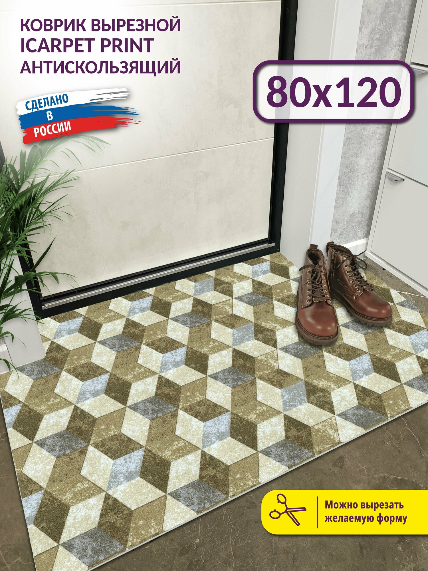 Коврик придверный вырезной Icarpet PRINT 120х200 3D Куб серо-бежевый, антискользящий влаговпитывающий