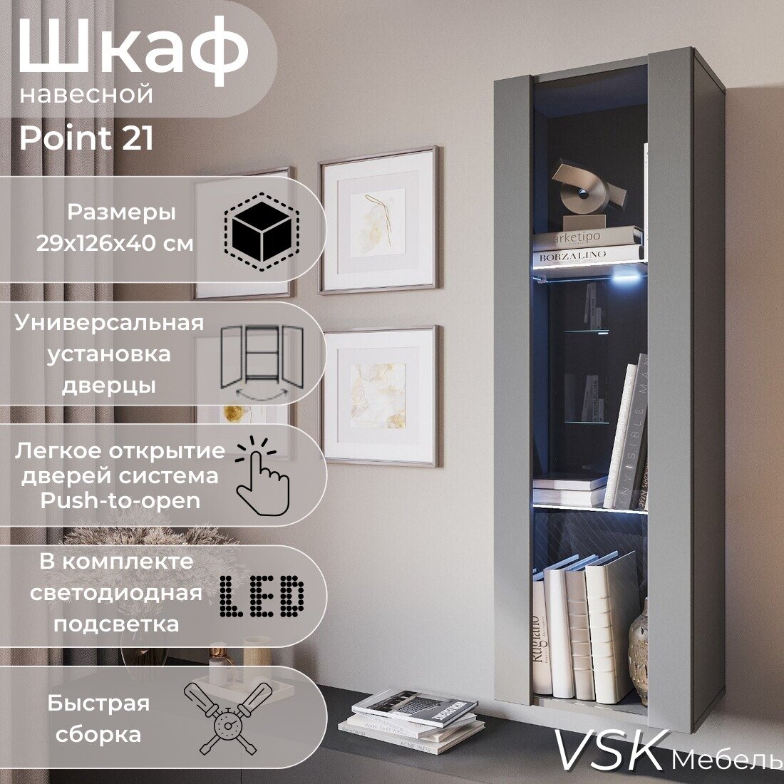 СохранитьШкаф витрина навесной с подсветкой POINT 21, Серый графит, 40х126х29 (ШхВхГ) интересное: