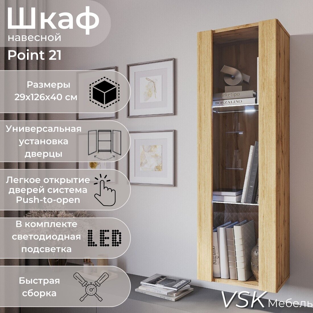Шкаф пенал, шкаф витрина, шкаф навесной, с подсветкой, POINT 21, Белый, 40х126х29 (ШхВхГ)