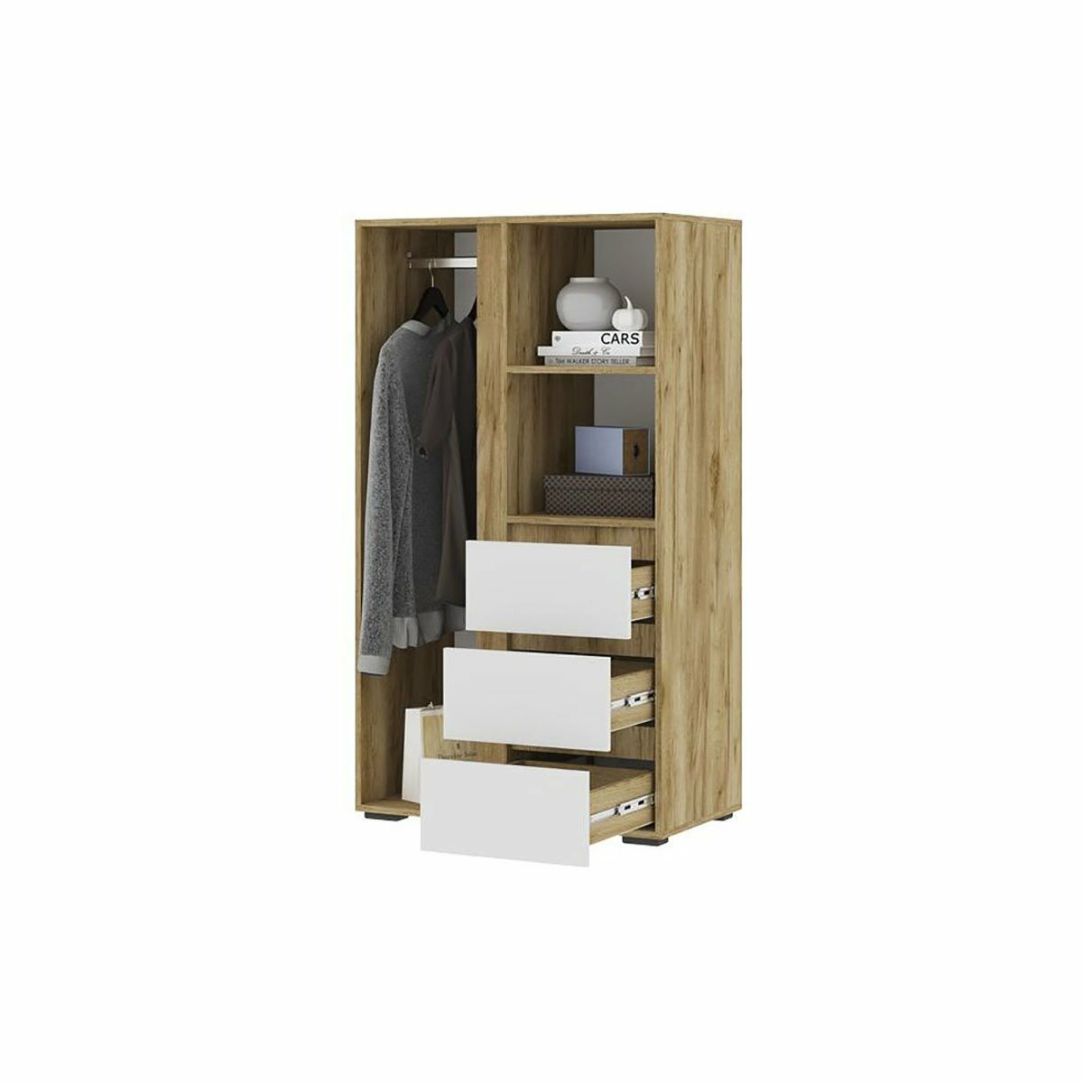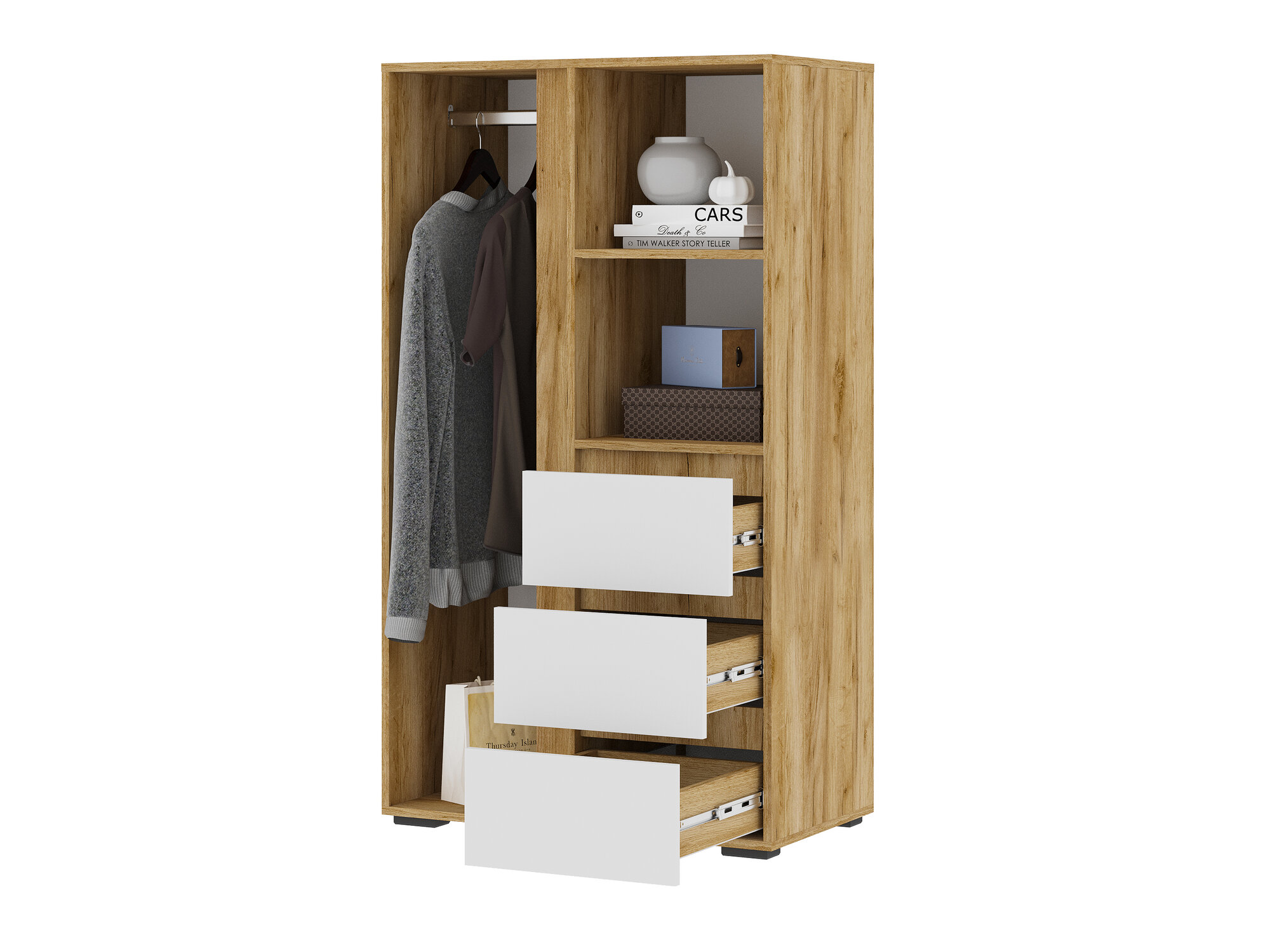 Распашной шкаф для одежды с ящиками, со штангой, с полками, 80х46х210 см, Белый / Дуб Крафт золотой, Хелен ШК 01