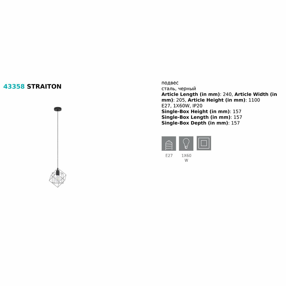 Светильник подвесной Eglo Straiton 43358, E27, 60Вт, кол-во ламп:1шт., Черный