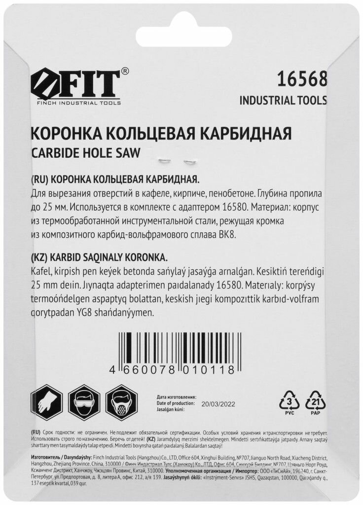 Коронка кольцевая по кафелю карбидная 73 мм, FIT 16505 (1 шт.)