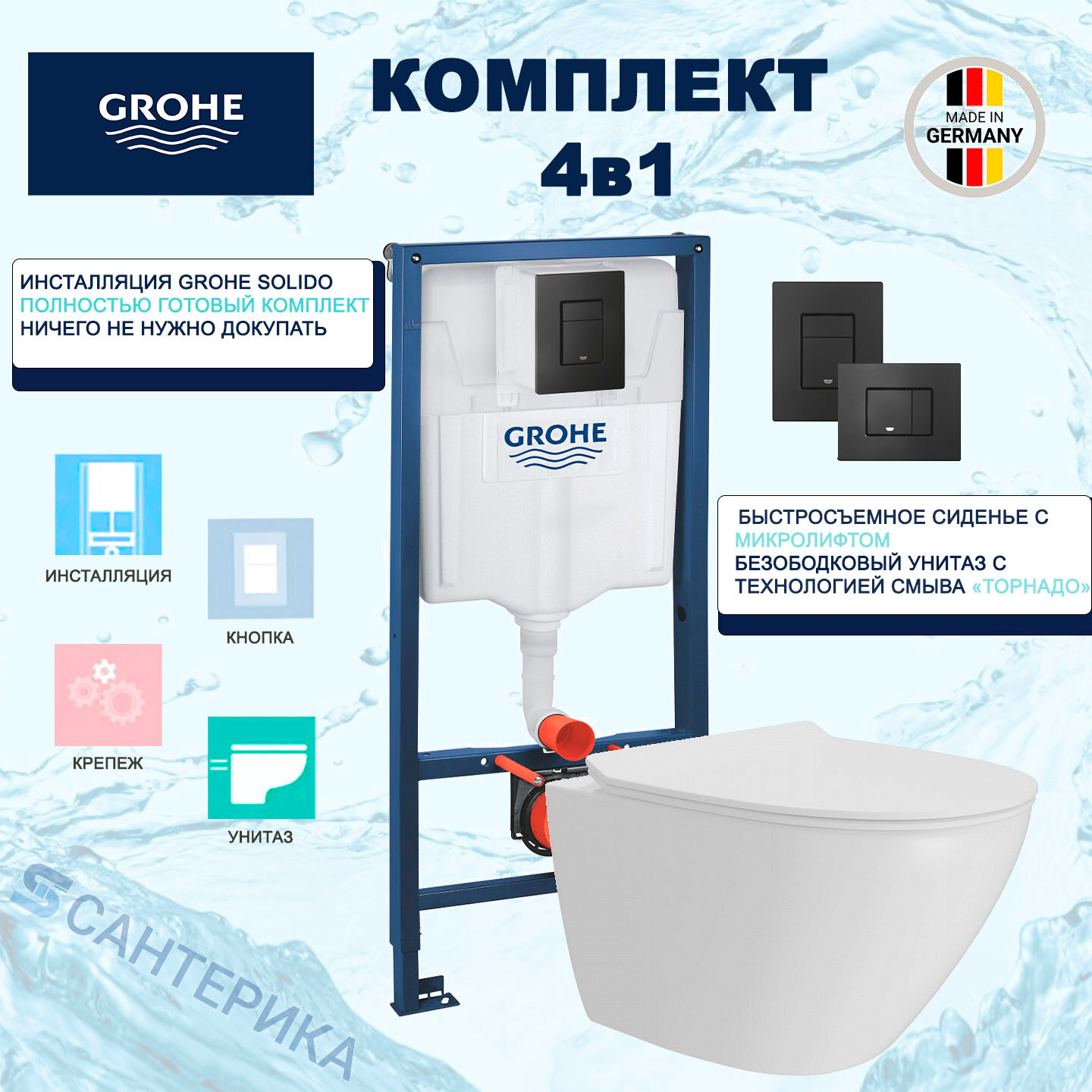 Комплект 4в1 инсталляция для унитазов Grohe Solido 38811KF0 + подвесной унитаз Santerika c технологией смыва "Торнадо" безободковый с крышкой микролифт