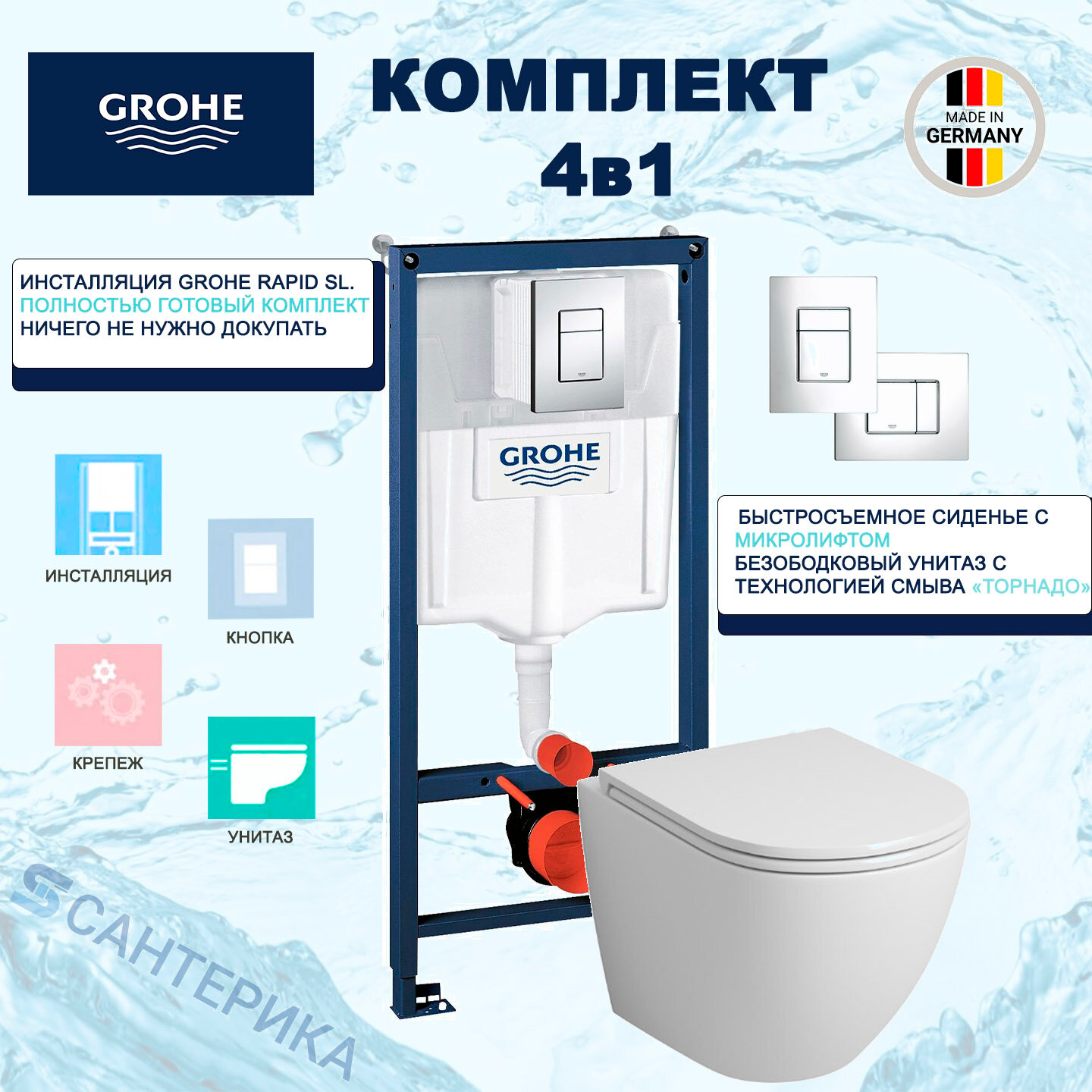 Комплект 4в1 инсталляция для унитазов Grohe Rapid SL + подвесной унитаз Santerika SAN.UNT.01 c технологией смыва "Торнадо" безободковый с крышкой микролифт