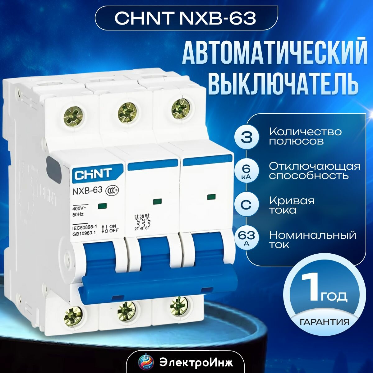 Автоматический модульный выключатель CHINT 3п C 63А 6кА NXB-63 (R) 814176