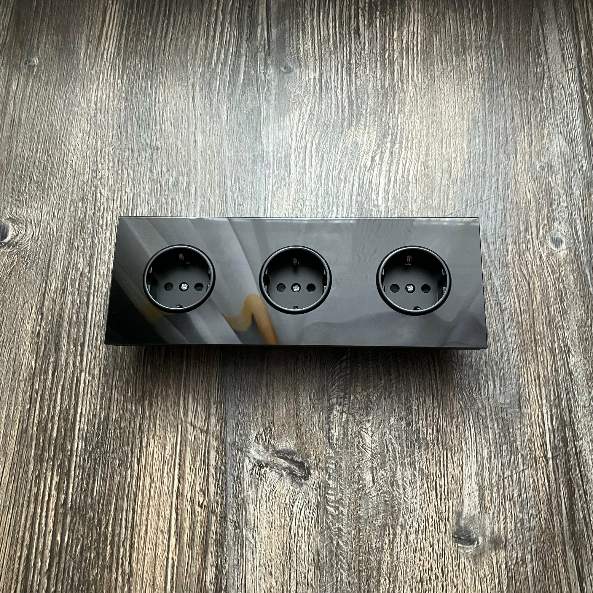 Купить Розетка тройная 16А 250В, со шторками, рамка закаленное стекло, Чёрный. F8