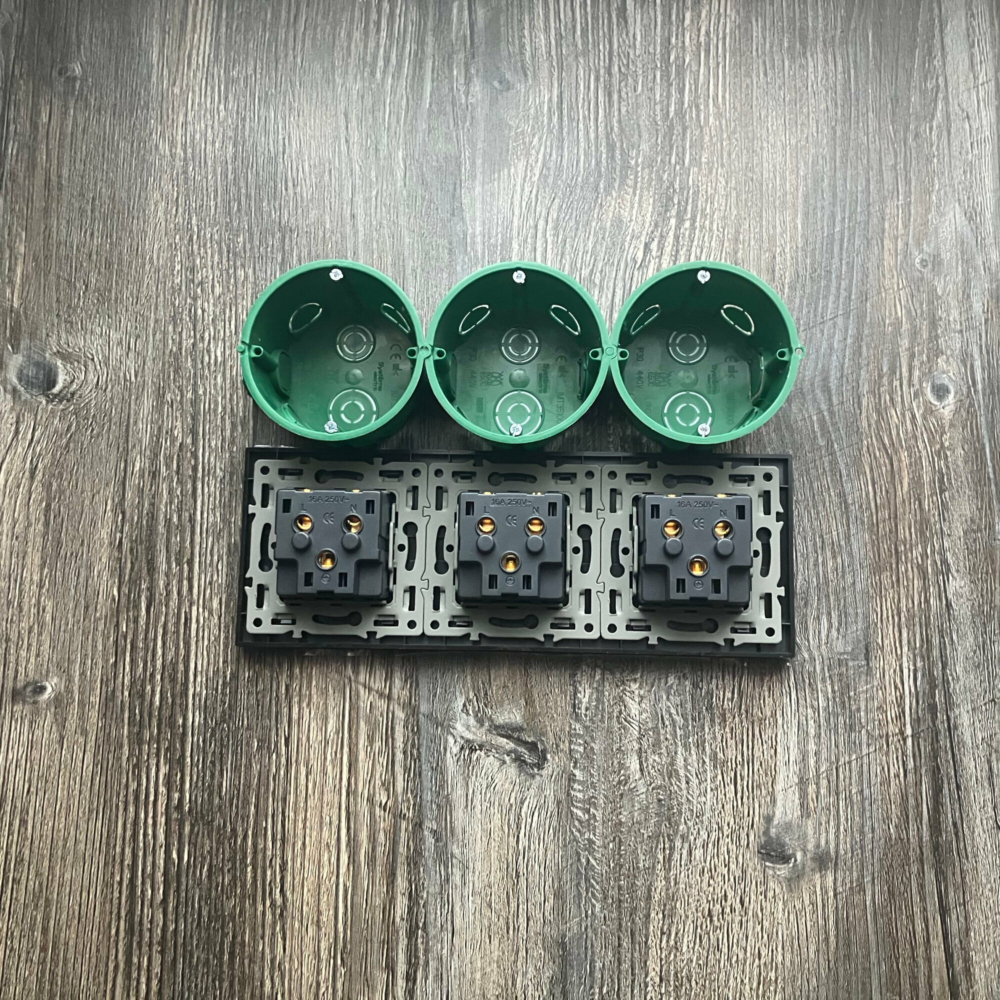 Розетка тройная 16А 250В, со шторками, рамка закаленное стекло, Чёрный. F8