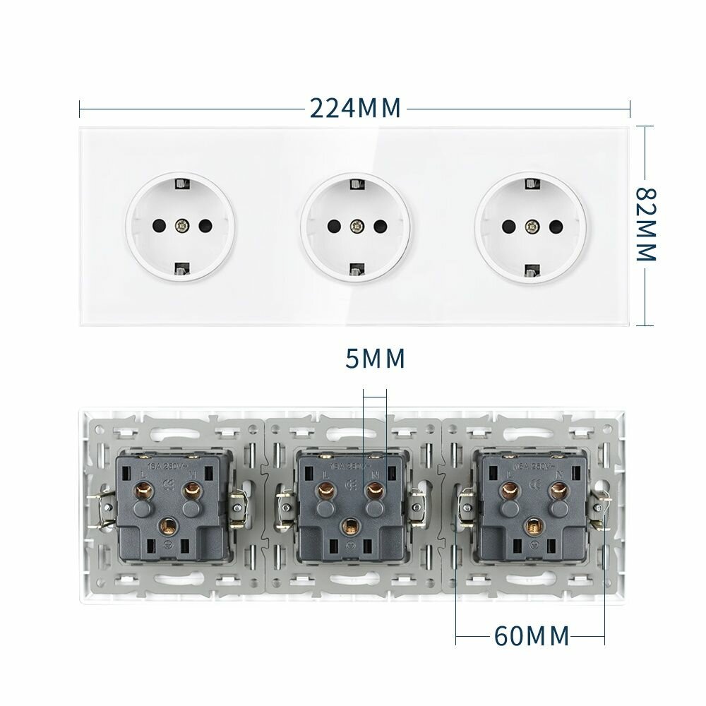 Розетка тройная 3 поста, 16А 250В, со шторками, рамка закаленное стекло, Белый. F8