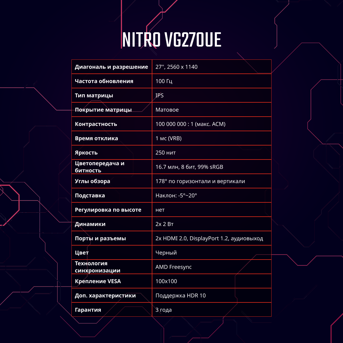 Монитор 27" ACER Nitro VG270UEbmiipx Black IPS, 2560x1440, HDMI+HDMI+DP, 4 ms, 178°/178°, 250 cd/m, 1000:1, 100Hz, MM интересное: