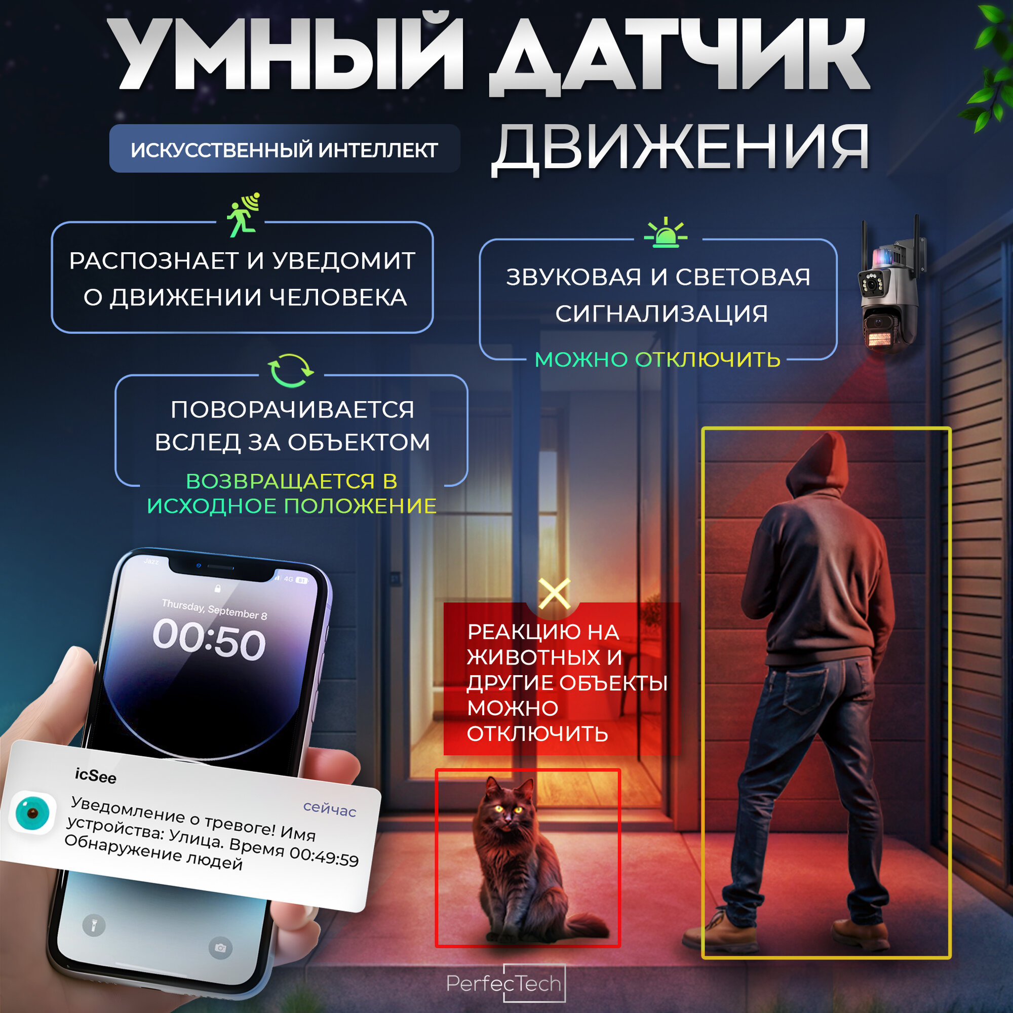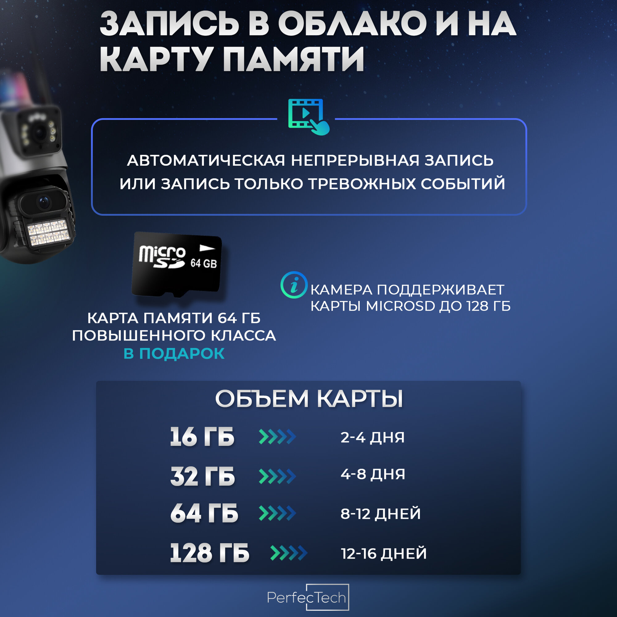 Камера видеонаблюдения уличная wi-fi двойная с сиреной + карта 64ГБ + кабель питания 3м интересное: