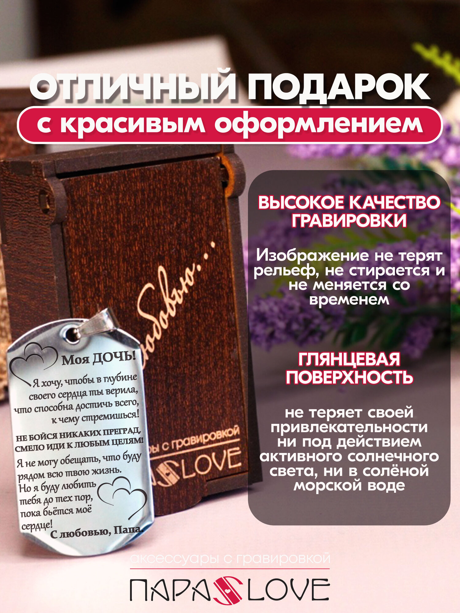 СохранитьБрелок для ключей с надписью "Моя дочь!" от папы с лазерной гравировкой в подарочной коробке. Жетон на сумку, рюкзак, ключи авто и дома интересное: