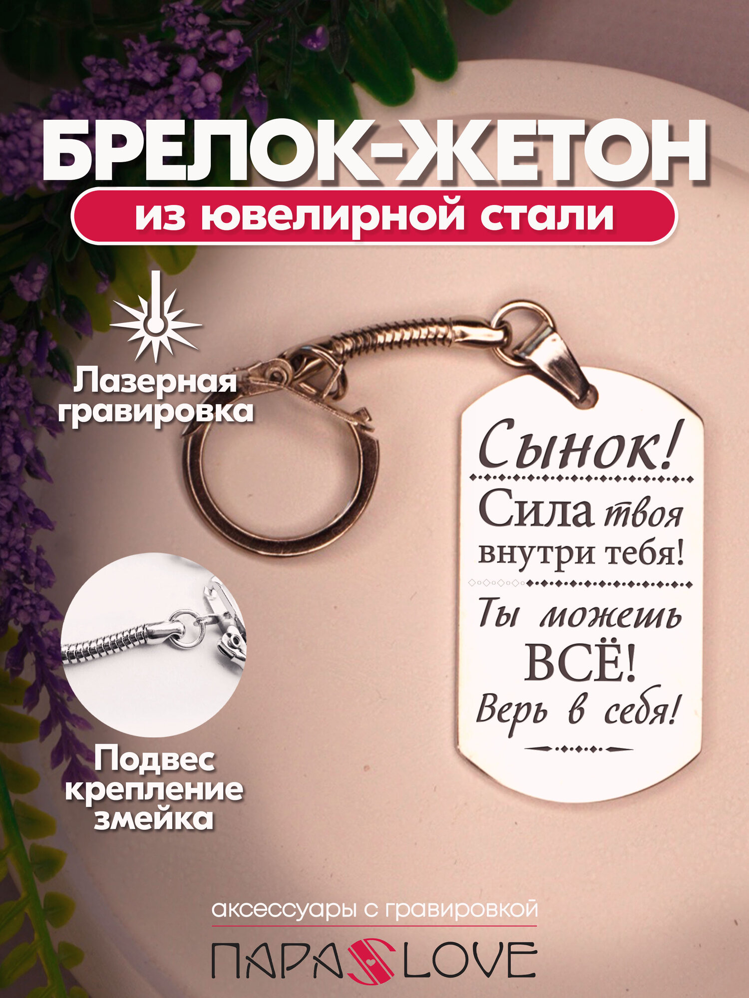 Брелок для ключей мужской с надписью "Мой сынок" от папы с лазерной гравировкой в подарочной коробке. Жетон на сумку, рюкзак, ключи авто и дома.