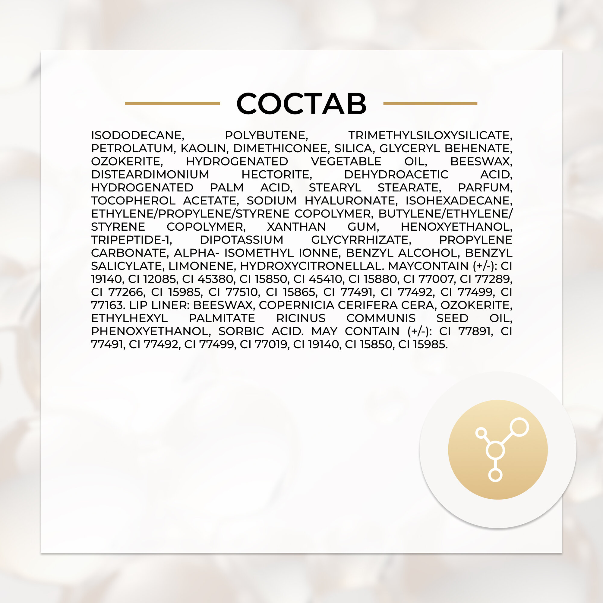 | Состав | isododecane, Synthetic Wax, Quaternium-90 Sepiolite, Bis-Carboxydecyl Dimethicone, Phenyl Trimethicone, Trimethylsiloxysilicate, Cera Alba, Quaternium-90 Montmorillonite, Glyceryl Behenate, Silica Dimethyl Silylate, Dimethicone, Disteardimonium Hectorite, Polysilicone-11, Tocopherol, Ascorbyl Palmitate, Ascorbic Acid, Citric Acid, Tocopheryl Acetate, Sodium Hyaluronate, PEG-8, Propylene Carbonate, PEG-8 Caprylic/Capric Glycerides, Octyldodeceth-25, Pentaerythrityl Tetra-di-t-butyl Hydroxyhydrocinnamate, Propylene Glycol, Decylene Glycol, Phenoxyethanol, Ethylhexylglycerin, Aqua (Water), Parfum (Fragrance), Benzyl Alcohol +/- CI 77891, CI 19140, CI 45380, CI 45410, CI 15850, CI 77007, CI 77510, CI 77491, CI 77492, CI 77499. |
