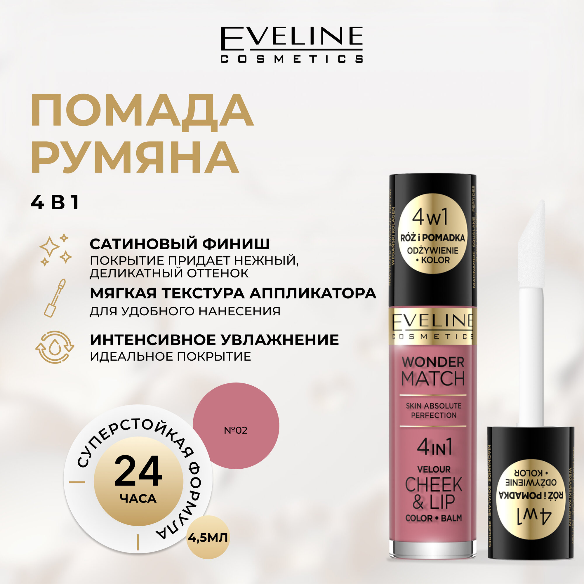 Купить Помада-румяна для губ и лица EVELINE WONDER MATCH жидкая тон №02