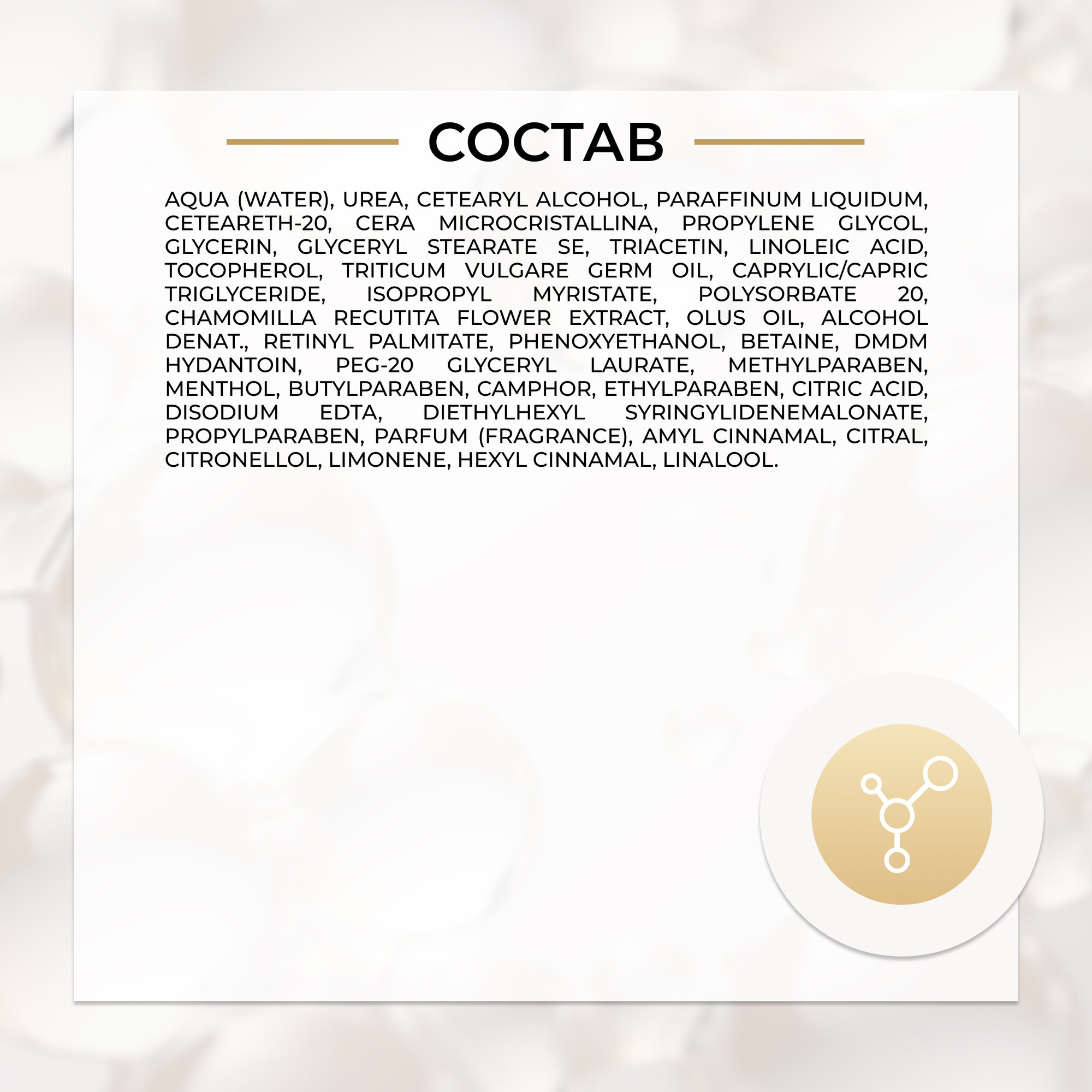 | Состав | Aqua (Water), Urea, Cetearyl Alcohol, Paraffinum Liquidum, Ceteareth-20, Cera Microcristallina, Betaine, Glycerin, Propylene Glycol, Glyceryl Stearate SE, Chamomilla Recutita Flower Extract, Isopropyl Myristate, Polysorbate 20, PEG-20 Glyceryl Laurate, Tocopherol, Linoleic Acid, Retinyl Palmitate, Triticum Vulgare Germ Oil, Alcohol Denat., Menthol, Camphor, DMDM Hydantoin, Benzoic Acid, Sorbic Acid, Phenoxyethanol, Parfum (Fragrance), Didodium EDTA, Amyl Cinnamal, Citramal, Citral, Citronellol, Limonene, Hexyl Cinnamal, Linalool. |