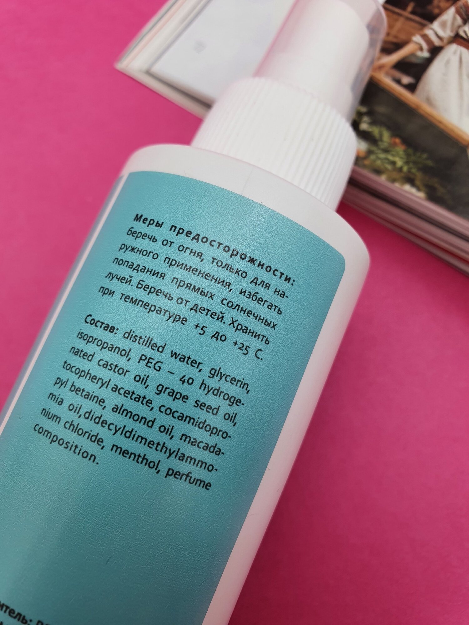 | Cостав | Distilled water, glycerin, isopropanol, PEG-40 hydrogenated castor oil, grape seed oil, tocopheryl acetate, cocamidopropyl betaine, almond oil, macadamia oil, didecyldimethylammonium chloride, menthol, perfume composition. |