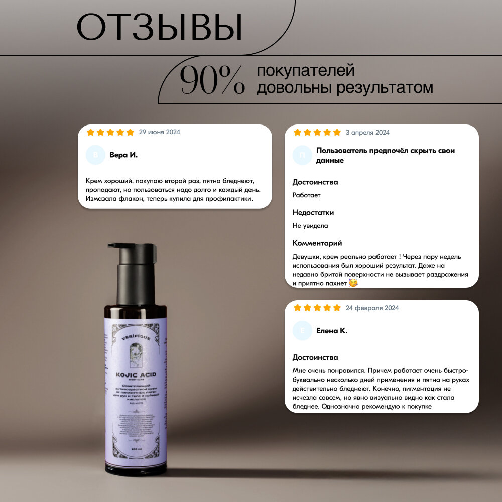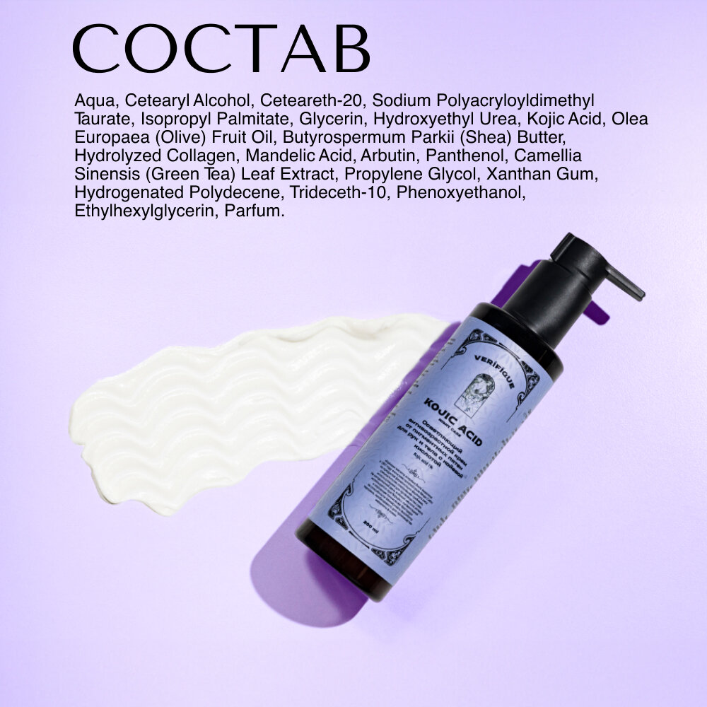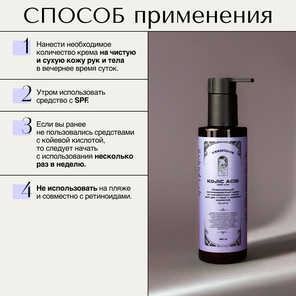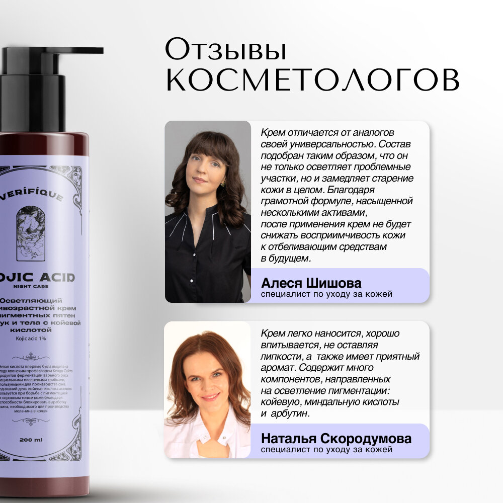 VERIFIQUE / Осветляющий антивозрастной крем от пигментных пятен для рук и тела с койевой кислотой 1%, 200 мл