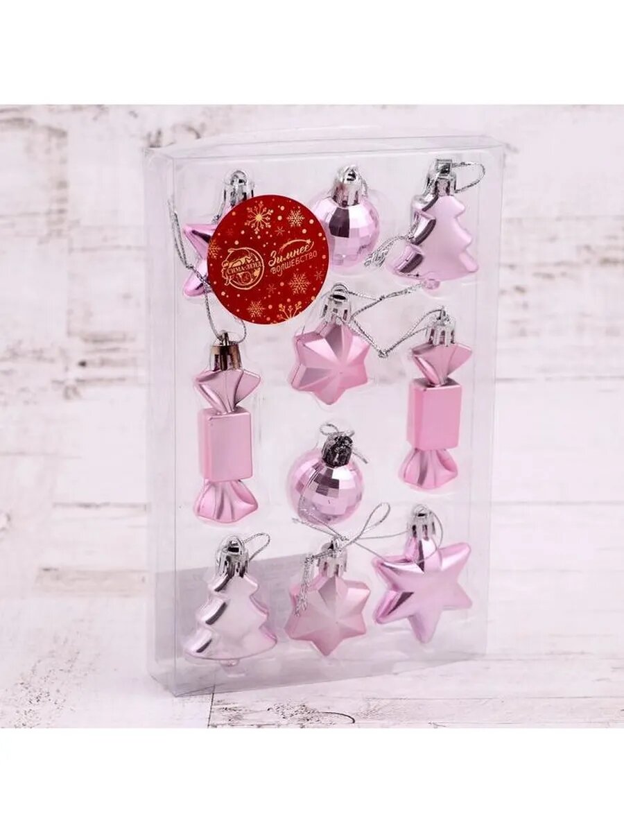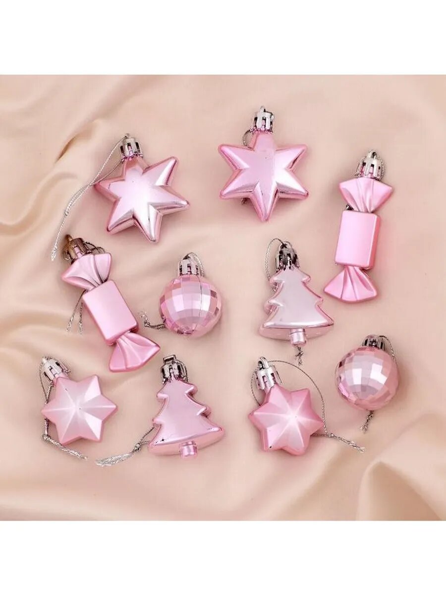 Набор украшений пластик 10 шт "Сюрприз" (4 звезды, 2 конфеты, 2 ёлки, 2 шара-4 см) розовый 4962779