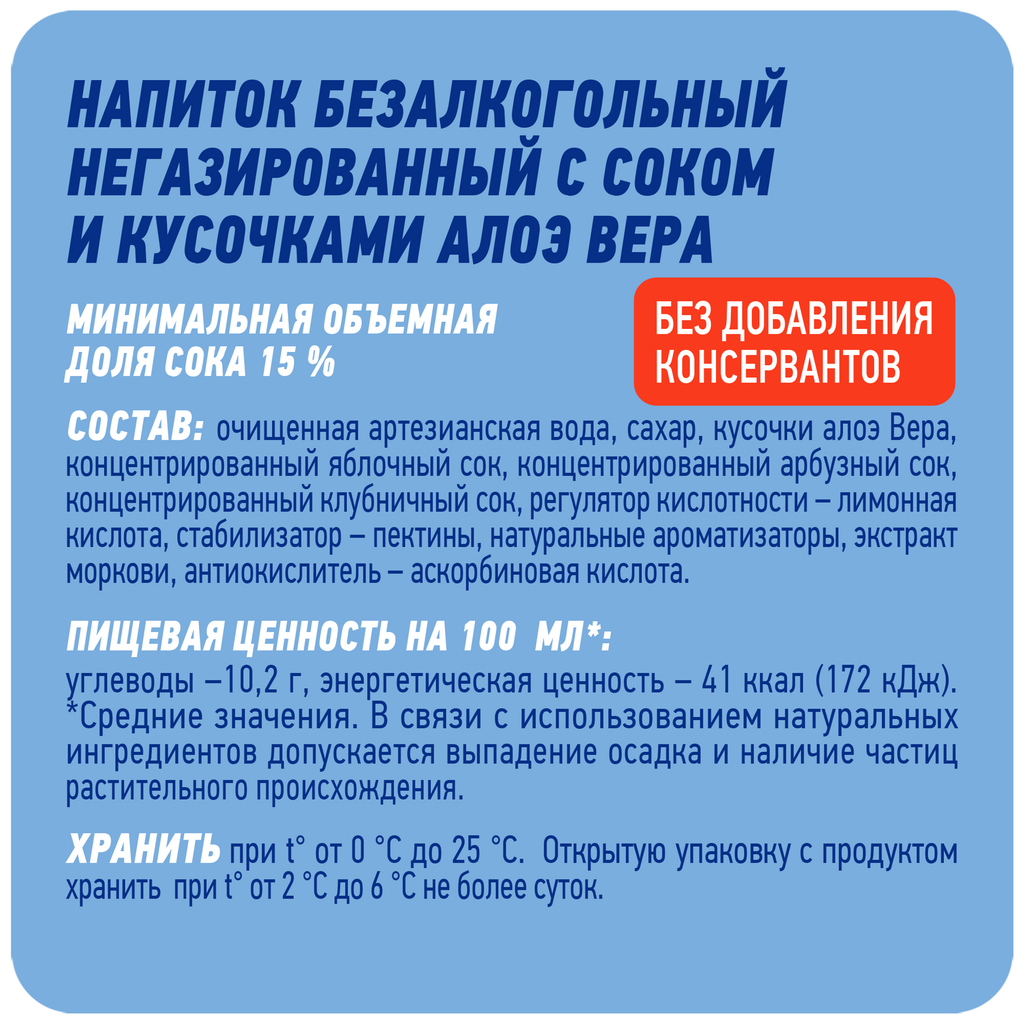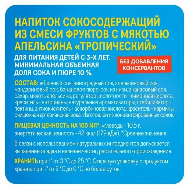 | Состав | яблочный сок, мякоть апельсина, сок красного винограда, апельсиновый сок, банановое пюре, сок киви, ананасовый сок, сахар, регулятор кислотности - лимонная кислота; натуральный краситель - антоцианы; стабилизатор - пектин; натуральный ароматизатор - тропический; антиокислитель - аскорбиновая кислота; вода. |