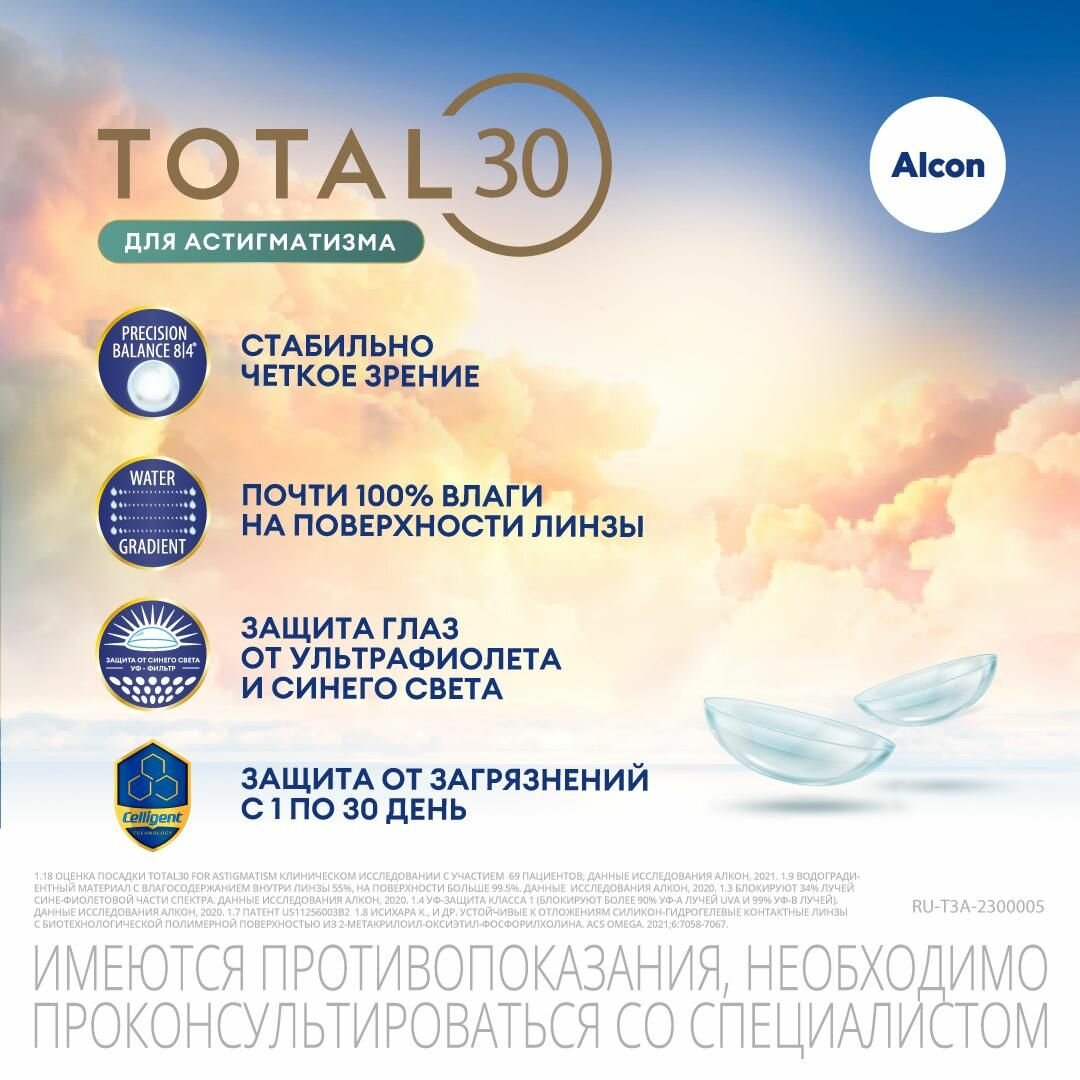 Астигматические линзы ALCON, Total 30 for astigmatism, -3.00 I цилиндр -0.75 I ось 180 I 3 линзы I ежемесячные I прозрачные