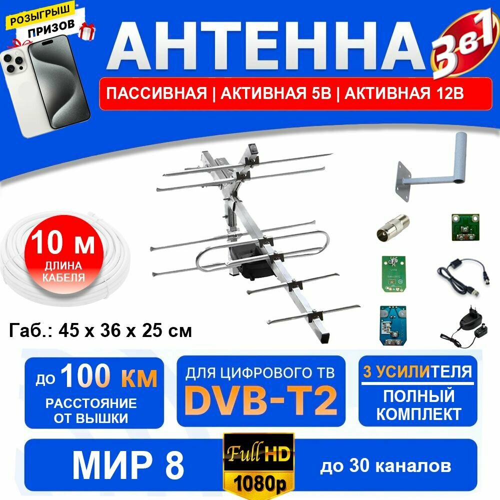МИР 19 (3 в 1 полный комплект до 138 км) Антенна для приема цифровых каналов, штекер, 5В и 12В усилитель, инжектор блок питания кронштейн кабель