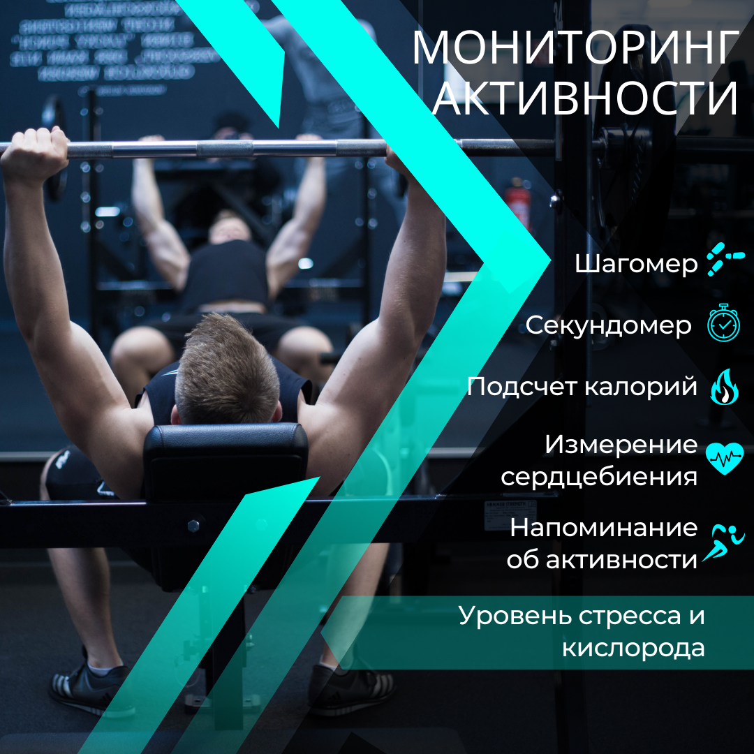 | Мониторинг | водный баланс, калорий, пульса, сна, температуры тела, термометр, тонометр, уровня кислорода в крови, уровня сахара в крови, физической активности |