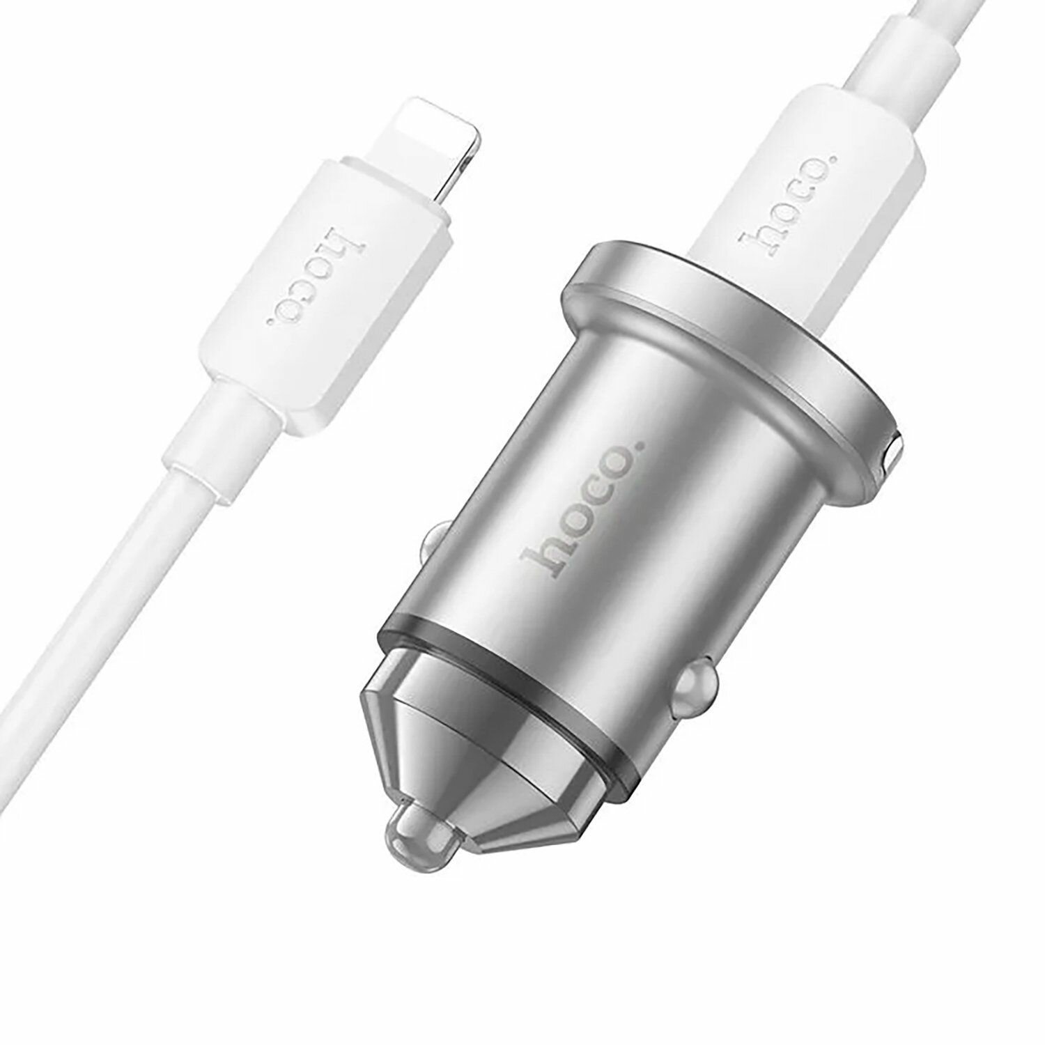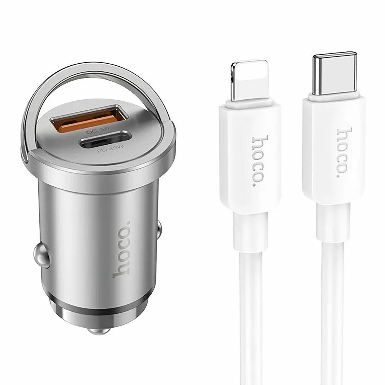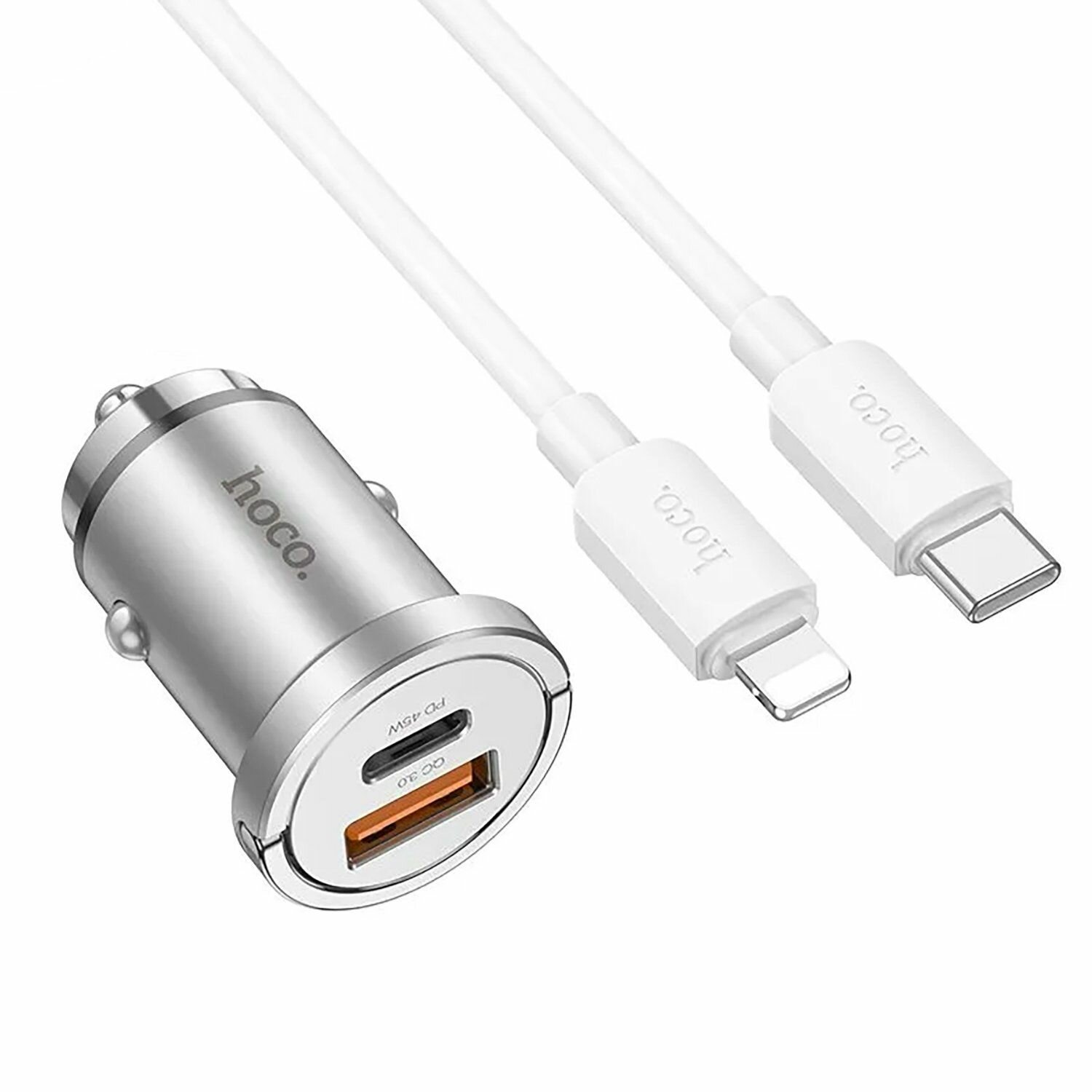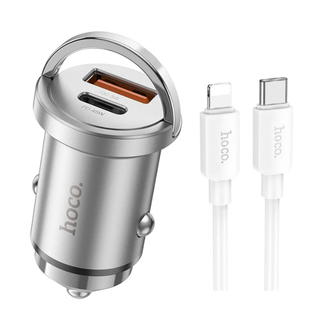 Купить Автомобильное зарядное устройство, 1 USB QC3.0+1 PD 45W (NZ10), HOCO, кабель Type-C to Lightning, серебряный