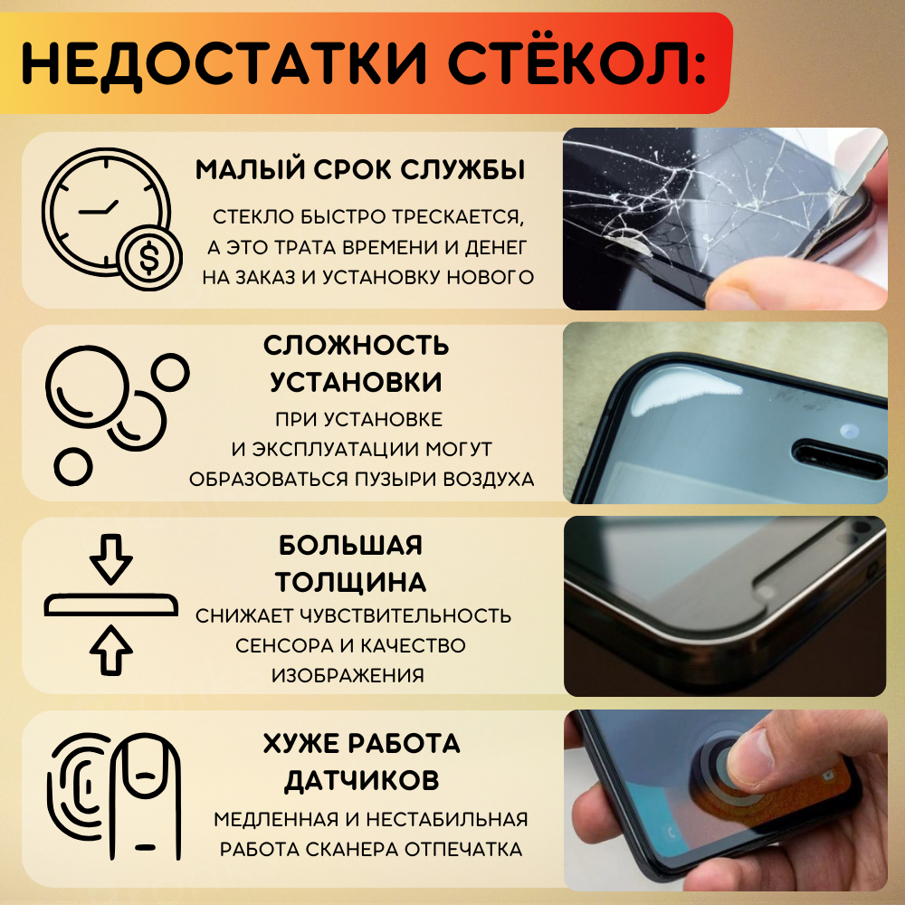 | Особенности | глянцевая поверхность / матовая поверхность / олеофобное покрытие / под чехол / прозрачность / самовосстанавливающаяся |