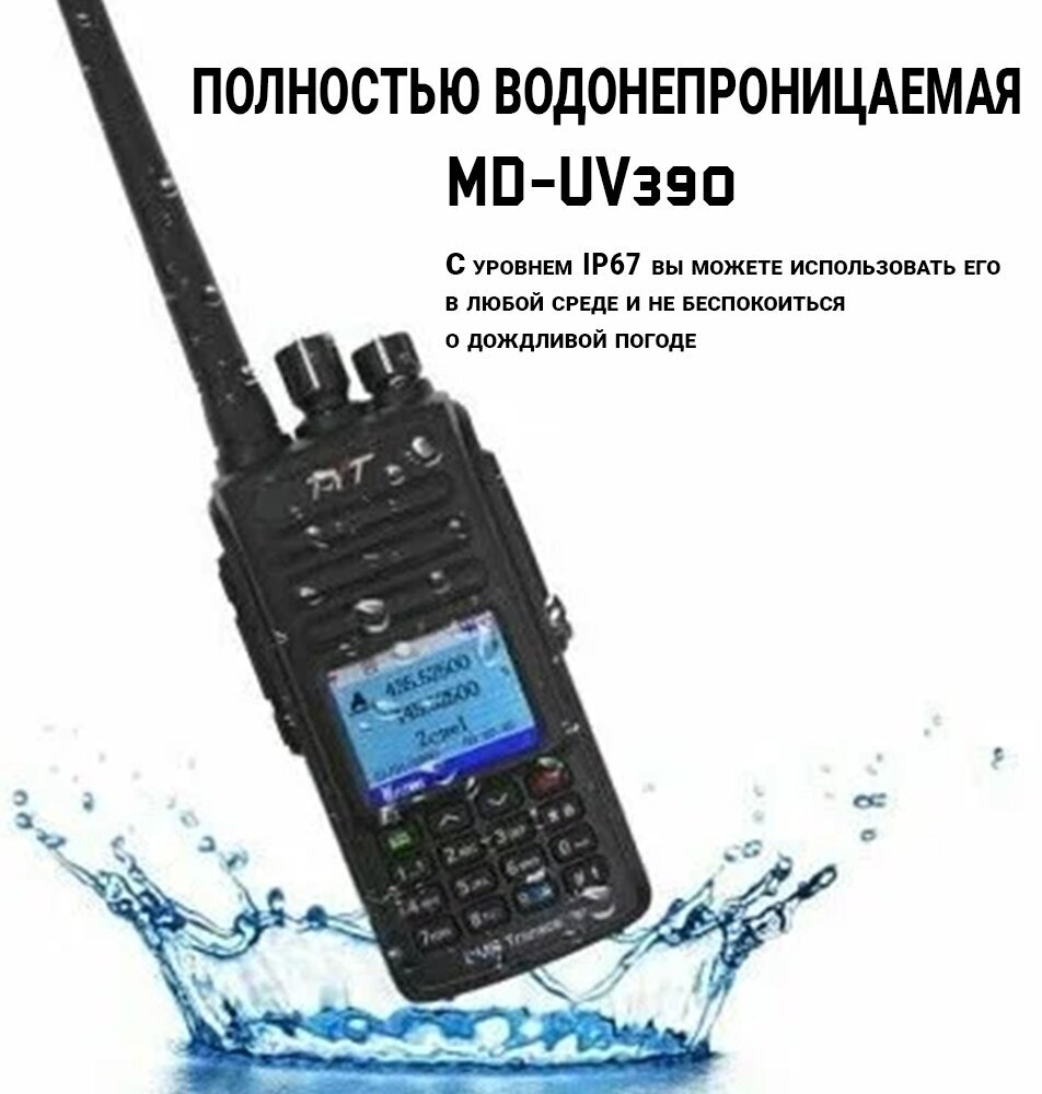 | Дополнительная информация | Цифровая радиостанция TYT MD-UV 390 DMR Диапазон частот, МГц VHF 136-174 / UHF 400-480. Питание Батарея Li-ion 7,4В/2800 мАч. Водозащищенный корпус класса IP-67, что подразумевает не только устойчивость радиостанции TYT MD-UV 390 DMR к попаданию под дождь, но и погружение в воду |