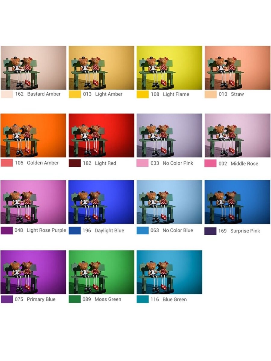 | Состав набора | набор фолиевых (гелевых) светофильтров |