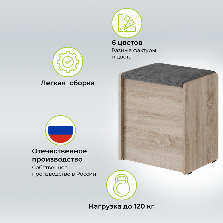 Пуф Чикаго Тип 1, Дуб сонома/Рогожка Серый, табурет для кухни, банкетка в прихожую, мебель для кухни, с ящиком для хранения