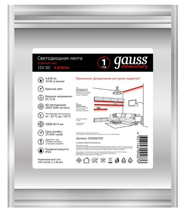 Лента светодиод 4,8Вт 12В 2835/60-SMD DC красный IP66 (ZIP Bag 5м) Gauss Elementary интересное: