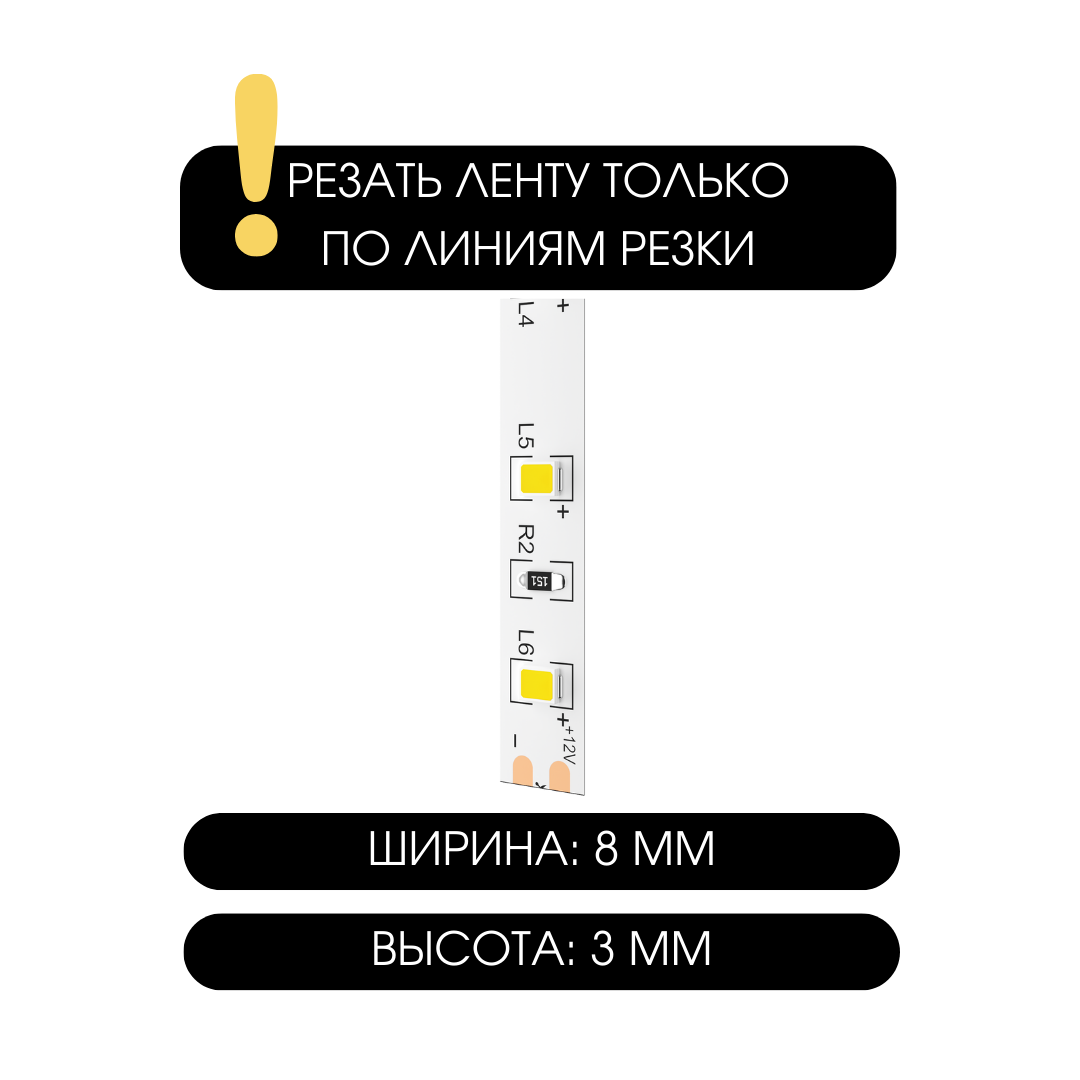 Светодиодная лента, подсветка Geniled - для комнаты, в гардероб, на кухню - Теплый белый свет / GL-120SMD2835 / 1100 Лм/м / 12В / длина - 5м / B - 8 мм / W - 12Вт / 3000 К / IP33