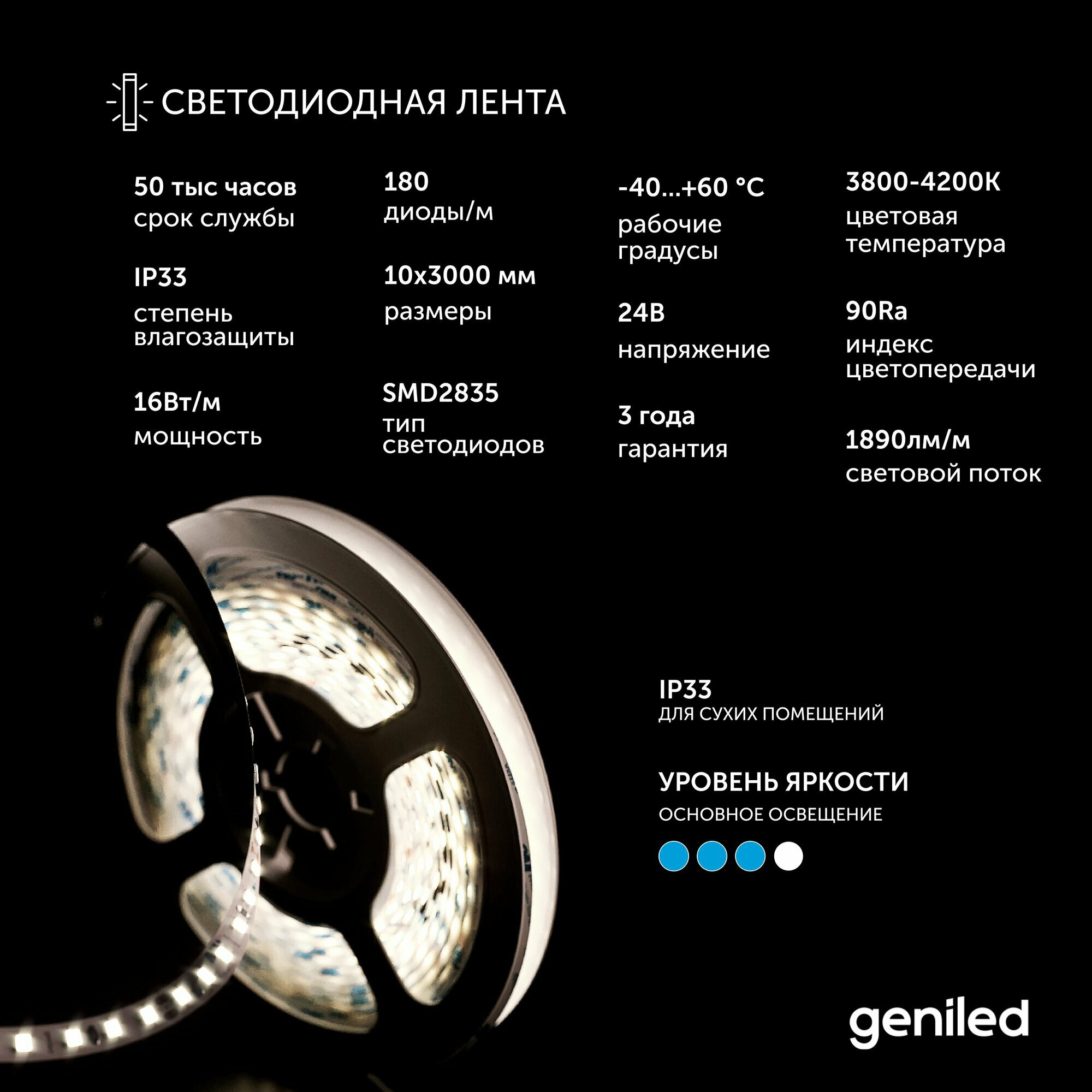 Светодиодная лента, подсветка Geniled - для комнаты, в гардероб, на кухню - Белый Нейтральный свет / GL-180SMD2835 / 1390 Лм/м / 24В / длина - 5м / B - 10 мм / W - 16 вт / 4000 К / IP33