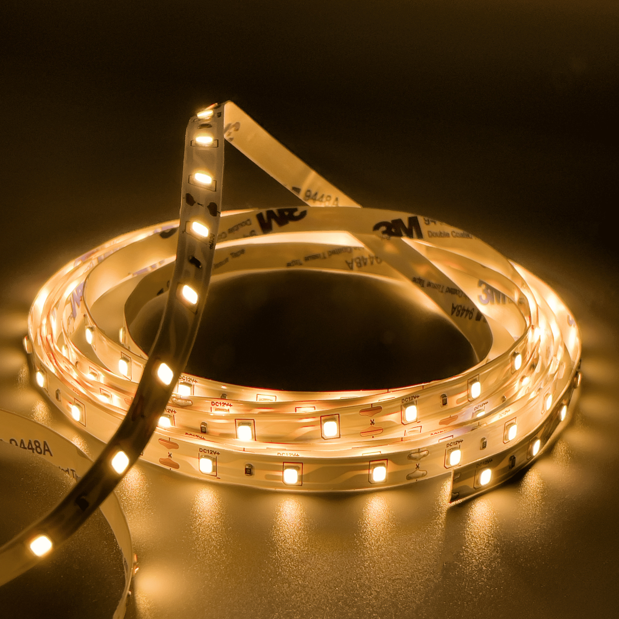 Светодиодная лента, подсветка Geniled - для комнаты, в гардероб, на кухню - Теплый белый свет / GL-60SMD2835 / 500 Лм/м / 12В / Длина - 2м / B - 8 мм / W - 5 вт / 3000 K / IP33