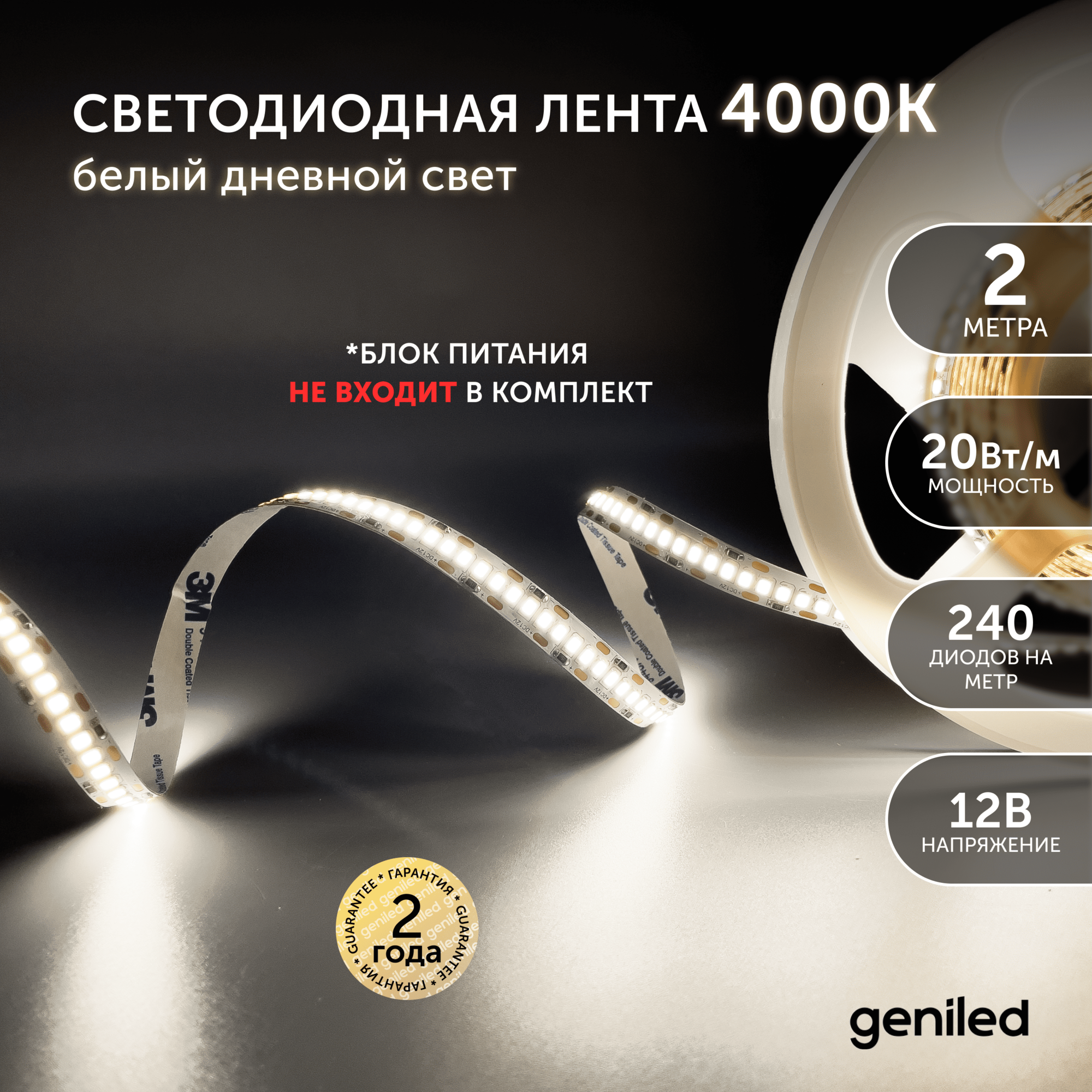 СохранитьСветодиодная лента 2м 12В 20Вт/м 4000К IP33 нейтральная дневная подсветка 240 led/m Geniled интересное: