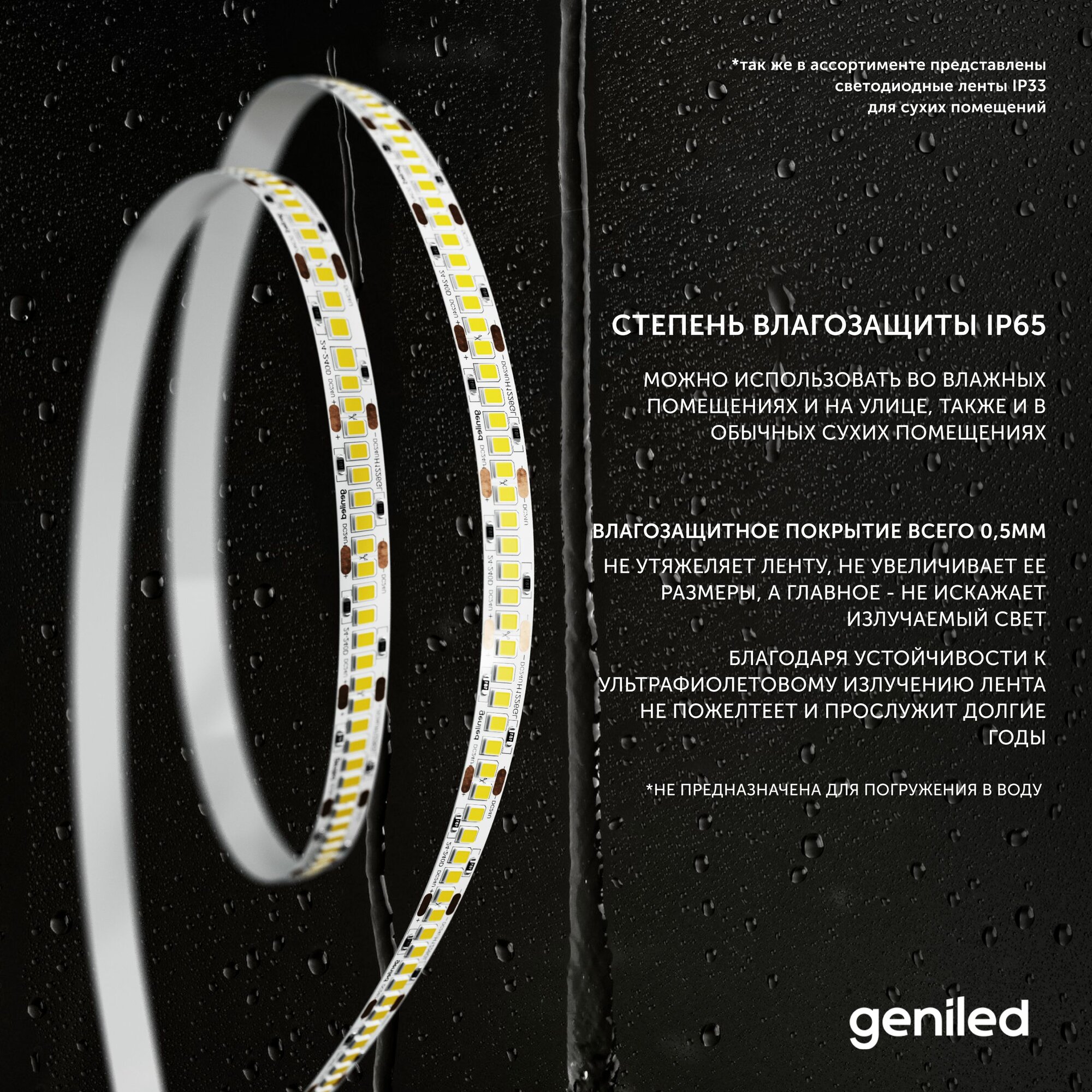 Светодиодная лента, подсветка Geniled - для комнаты, в гардероб, на кухню, на улицу, в ванную - Теплый белый свет / GL-180SMD2835 / 1500 Лм/м / 12В / Длина - 5м / B - 10 мм / W - 16 вт / 3000 К / IP65