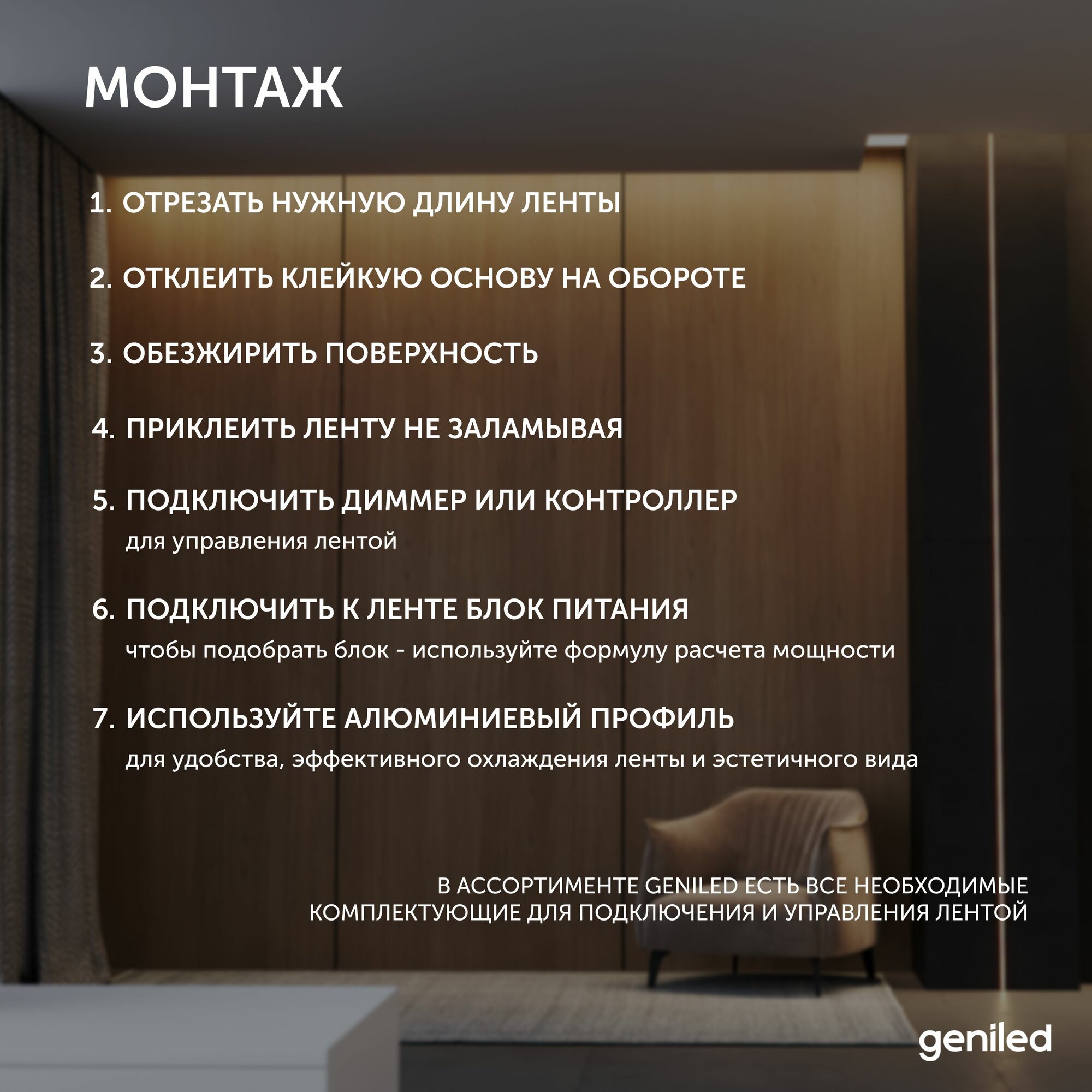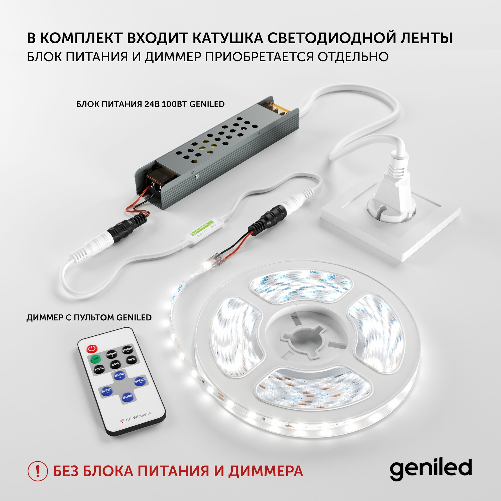 Светодиодная лента, подсветка Geniled - для комнаты, в гардероб, на кухню - Белый Нейтральный свет / GL-120SMD2835 / 1180 Лм/м / 12В / длина - 5м / B - 8 мм / W - 12Вт / 4200 К / IP33