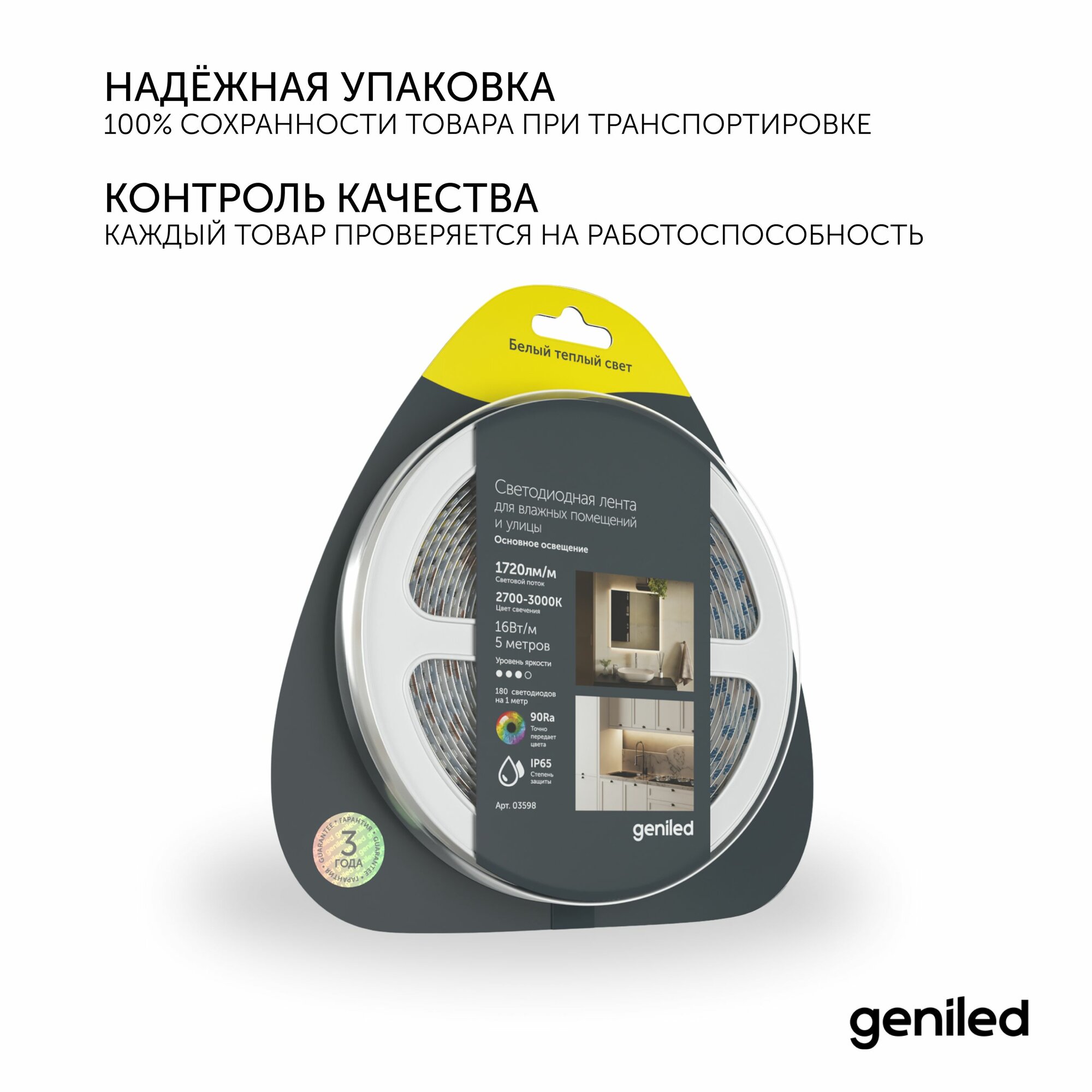 СохранитьСветодиодная лента 5м 24В 16Вт/м 3000К IP65 теплая подсветка влагостойкая уличная 180 led/m Geniled интересное: