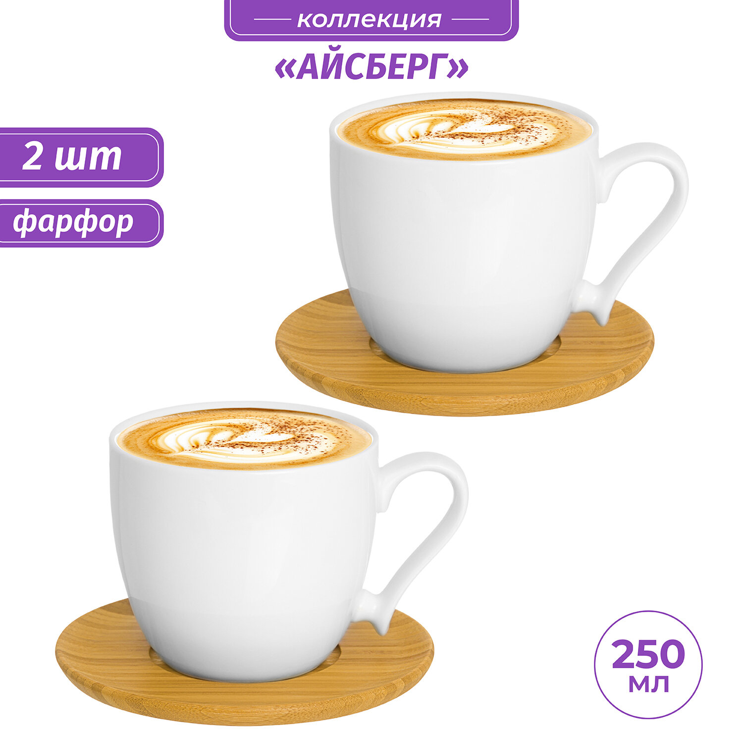 Чашка / кружка 2 шт для капучино и кофе латте 250 мл Elan Gallery Снежинка + деревянная подставка, набор