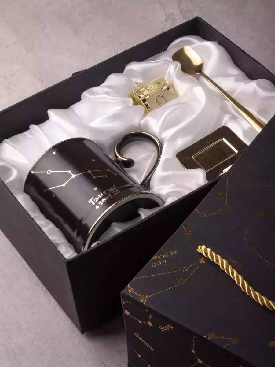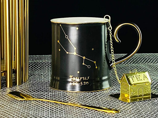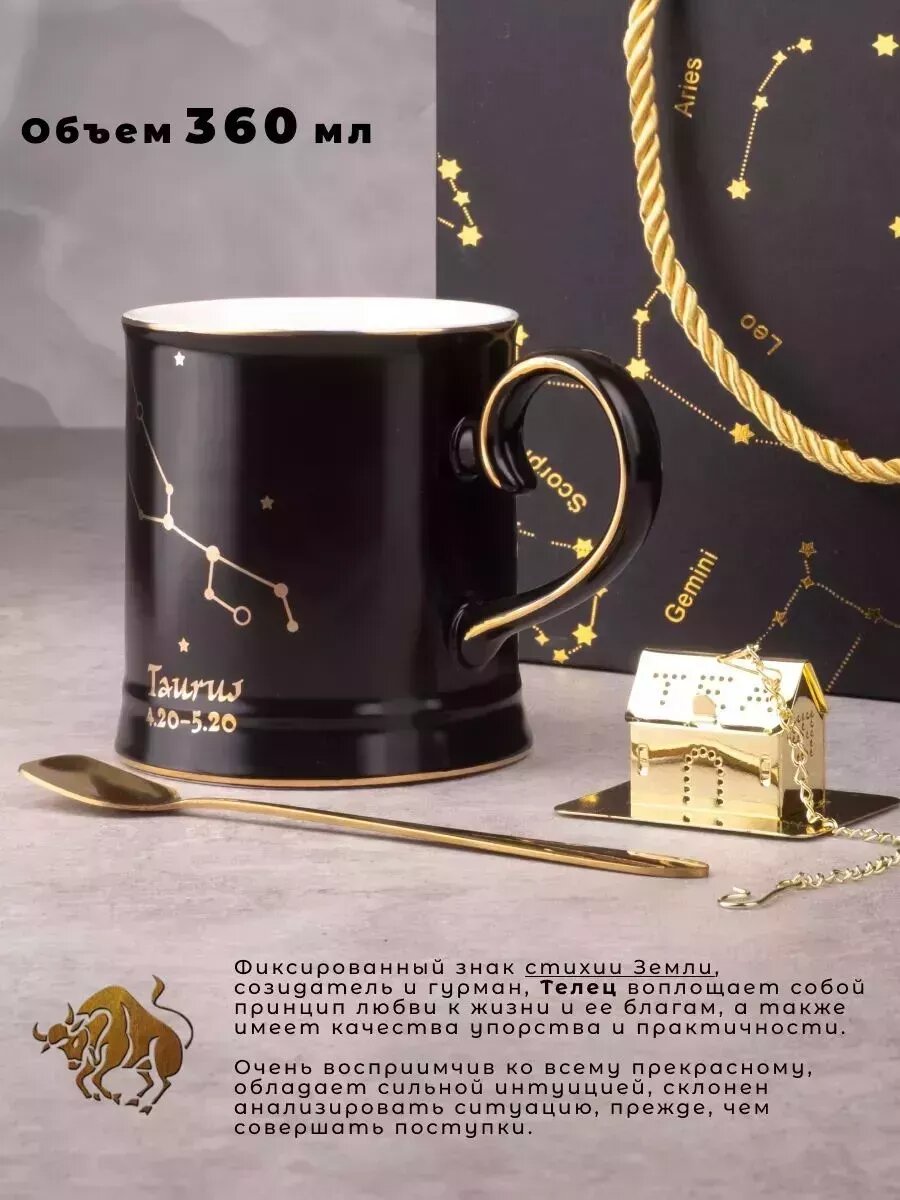 Купить Кружка 360мл с ложкой и фильтром телец в под.уп.(х12)Фарфор
