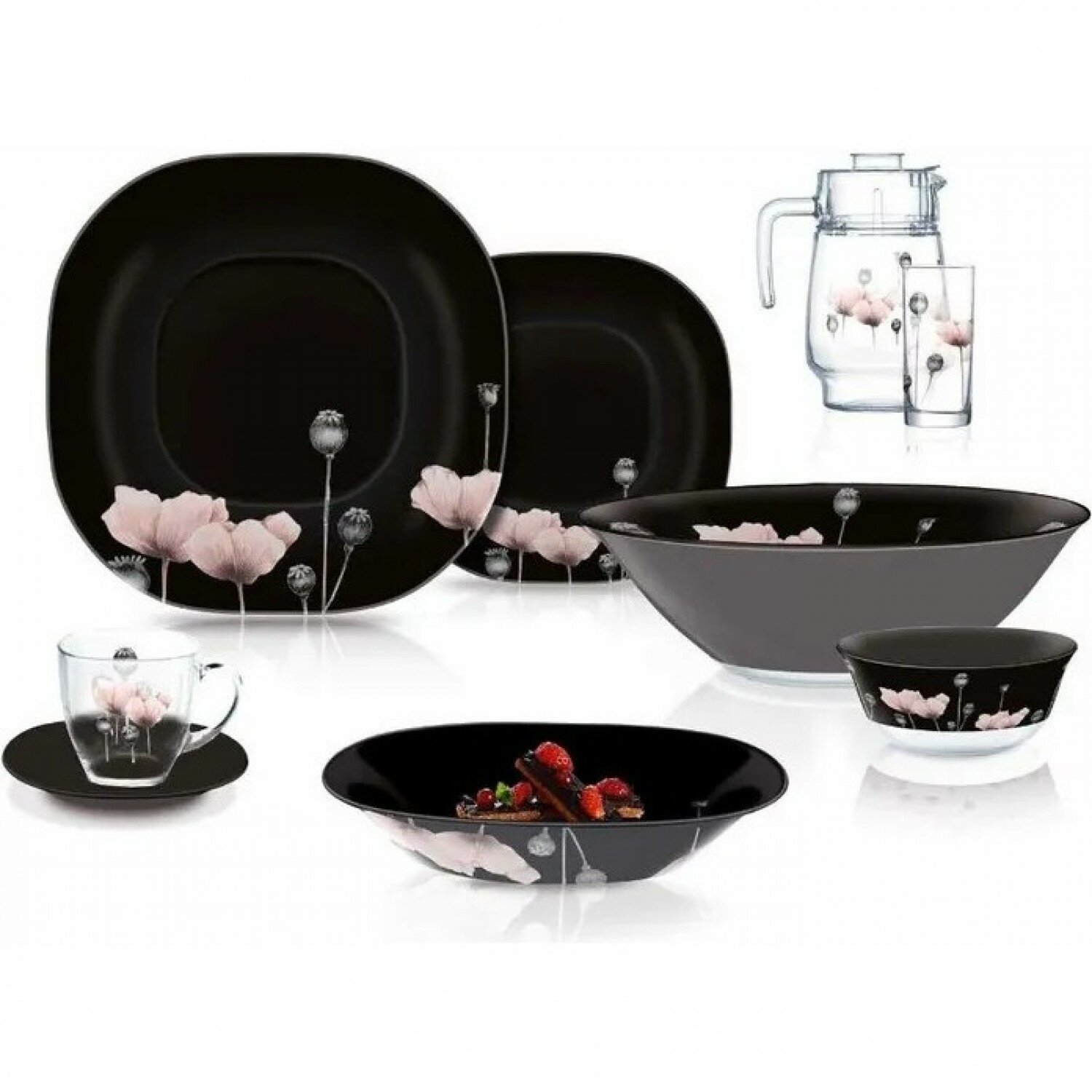 | Состав набора | блюдо, блюдце, кружка, крышка, кувшин, пиала, салатник, стакан, тарелка десертная, тарелка обеденная, тарелка суповая, чашка |